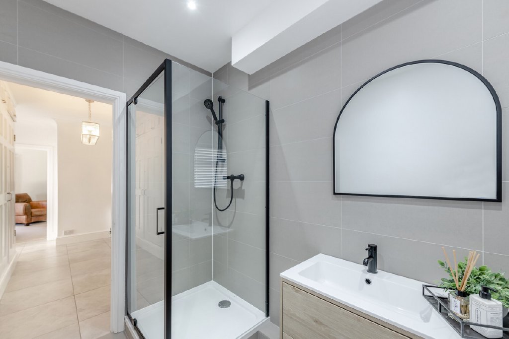 There is also a ground-floor double bedroom with a bay window overlooking the front garden, located next to a stylish shower room, making it ideal for guests or multigenerational living.