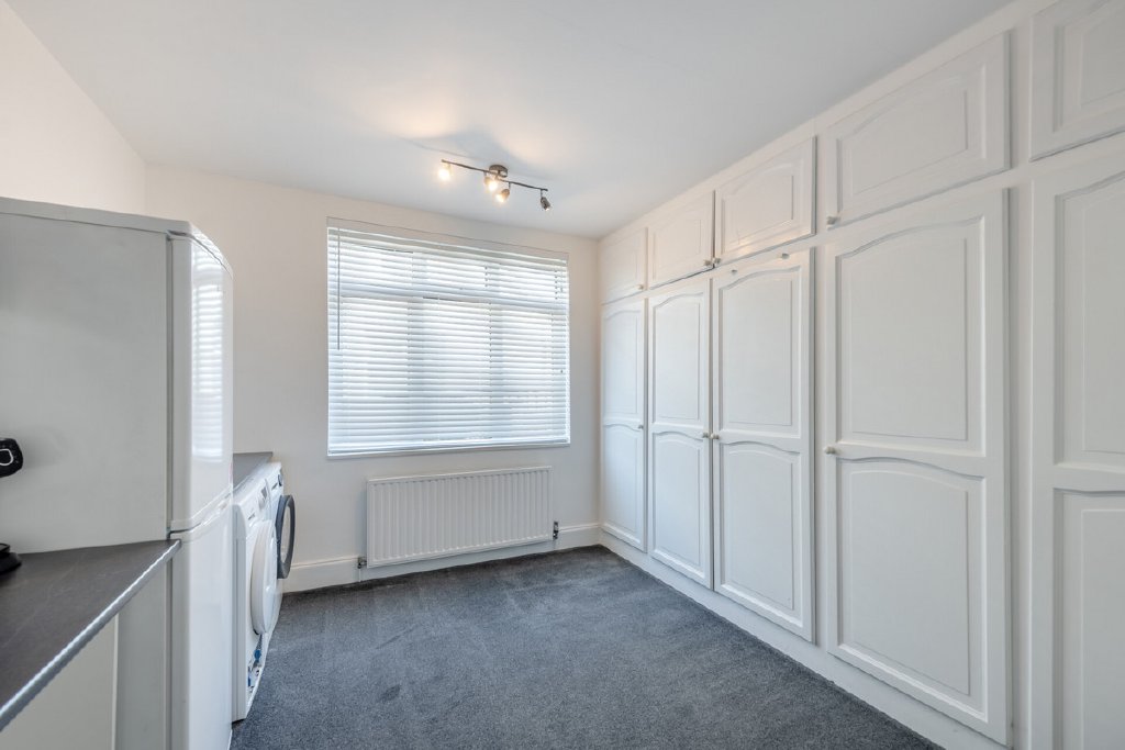 Adjoining the kitchen is a large utility/laundry room with a full wall of floor-to-ceiling built-in storage, space and plumbing for a washing machine and dryer, and room for an additional fridge/freezer, along with useful worktop and shelving space.