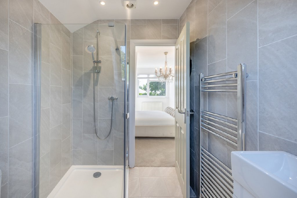 The principal bedroom is a light and spacious room, dramatically lit with a low hanging chandelier, adding a touch of glamour. Built in wardrobes provides practical storage which maximises the use of the space. This room also enjoys the added benefit of an en-suite shower room.