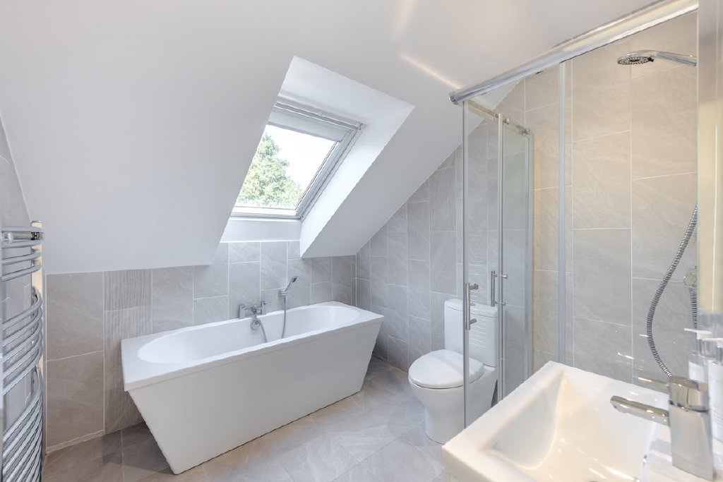 The luxurious family bathroom offers a sense of calm and comfort, featuring both a bathtub and a separate shower.