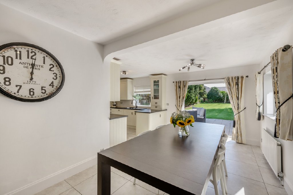 The L-shaped kitchen/dining room provides a large, open space ideal for family life and entertaining. French doors open directly onto the sun terrace and garden, creating a seamless indoor/outdoor flow. The shaker-style kitchen includes a range of built-in storage and integrated appliances: fridge/freezer, dishwasher, Neff double oven, and Neff hob. The sink is positioned under the window, enjoying pretty views of the garden.