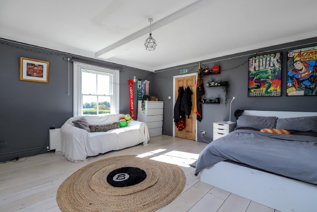 BEDROOM 2 16' 10" maximum x 15' 8" maximum (5.13m x 4.78m) Double glazed window to side aspect with far reaching views over farmland and woodland beyond, radiator, stripped and painted floorboards, ceiling coving, door to en-suite, double glazed window to front aspect overlooking fields, farmland and towards Portsdown Hill in the distance.