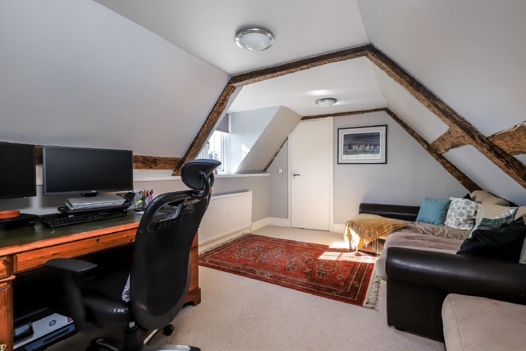 BEDROOM 6 16' 1" x 9' 8" (11'4" max.) (4.9m x 2.95m) Measurements taken from approximately 3'0" off floor level with eaves to front and rear ceiling restricting headroom, exposed beams to walls and ceiling, double glazed dormer window to front aspect with views over farmland, woodland and Portsdown Hill beyond, radiator, double glazed window to side aspect with views over the garden and fields, currently used as a study.