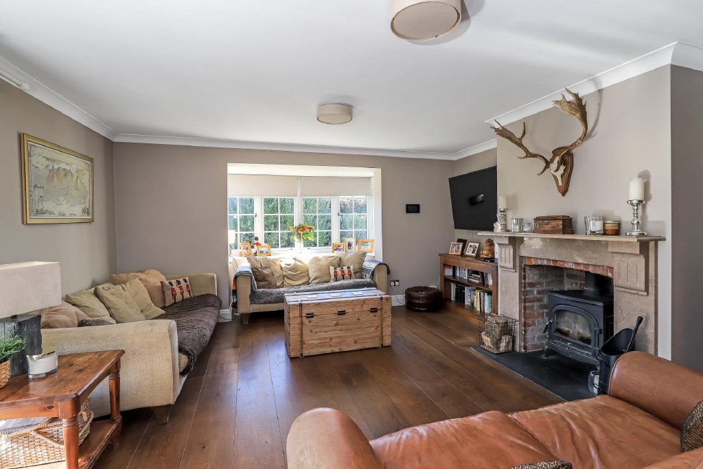 DRAWING ROOM 20' 0" into bay window x 15' 2" (6.1m x 4.62m) Double glazed square bay window to side aspect overlooking garden with double radiator under, matching solid oak flooring, central chimney breast with granite surround fireplace with brick inlay, log burner and slate hearth, double glazed sash window to front aspect overlooking garden with far reaching views over farmland, woodland and towards Portsdown Hill in the distance, second radiator, ceiling coving.