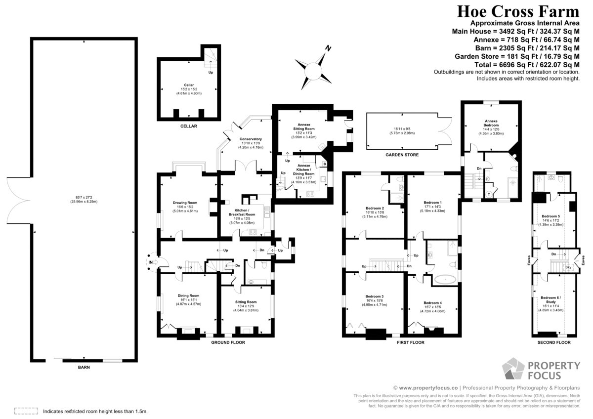PROPERTY SUMMARY Hoe Cross Farm is an outstanding home with a symmetrical frontage and abundance of character which has been sympathetically improved and redecorated by the current owners. The footprint provides a maximum of 6696 sq ft of living space incorporating the main house, annexe, barn and garden store, the primary house provides 3492 sq ft of living space and comprises: hallway, drawing room, dining room, sitting room, cloakroom, kitchen/breakfast room and conservatory on the ground floor with a large cellar/family/hobbies room. On the first floor are four double bedrooms, one with an en-suite shower room and a large family feature bathroom, on the top floor are two further bedrooms and en-suite shower room. Attached on the west wing is a one bedroom annexe with sitting room and kitchen/dining room on the ground floor with a bedroom and large bathroom on the first floor. The imposing house is set in approximately 1.3 acres and benefits from a large garden store and 2305 sq ft barn which could be converted to stabling or separate living accommodation (subject to planning consent). The original property is believed to be dated back in parts to some 300 years ago, the central front door faces towards Hoe Cross crossroads and there are far reaching views for many miles towards Portsdown Hill, benefiting from being approximately 400 ft above sea level with farmland and woodland views on three aspects.