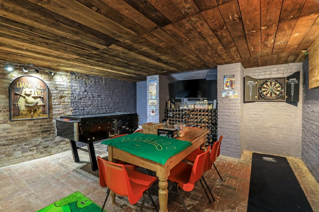 GAMES / HOBBY ROOM 15' 2" x 15' 2" (4.62m x 4.62m) Wood panelled ceiling, tall contemporary style radiator, spotlights, exposed brick to all walls with painted sections, brick flooring, wall lights.