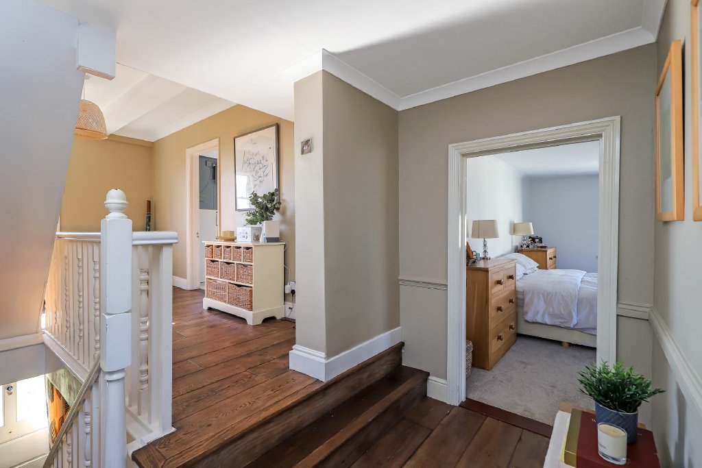 FIRST FLOOR Landing to rear, steps leading up to primary landing and staircase rising to top floor, panelled doors to primary rooms, window to front aspect with far reaching views over farmland, woodland and towards Portsdown Hill in the distance, ceiling coving, wooden flooring, radiator.