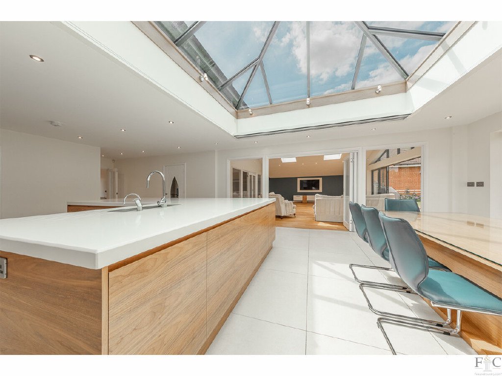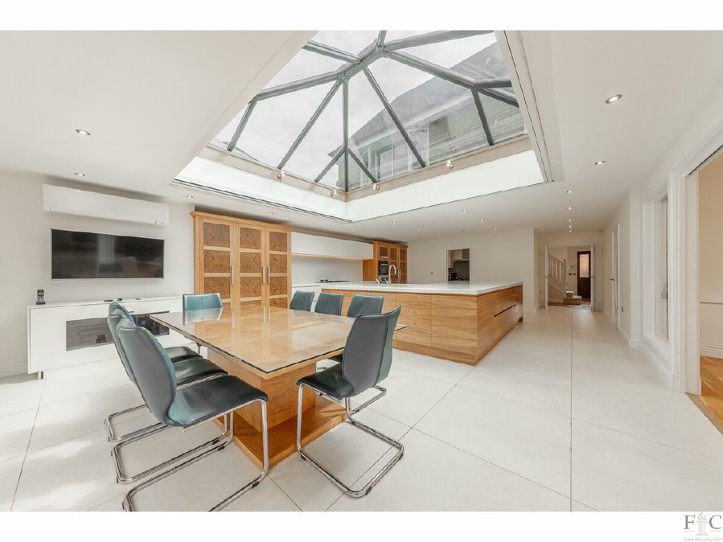 The heart of the home is the stunningly extended Alexander Lewis kitchen, a masterpiece of design featuring tiled flooring with underfloor heating and state-of-the-art air conditioning. Equipped with top-tier Miele appliances set against exquisite cabinetry and striking counter-tops, this kitchen is a chef's dream. Highlighted by a vast skylight with remote-controlled shutters, it bathes the area in natural light, while bi-fold doors extend the living space into the verdant rear garden patio—ideal for entertaining and relaxation.