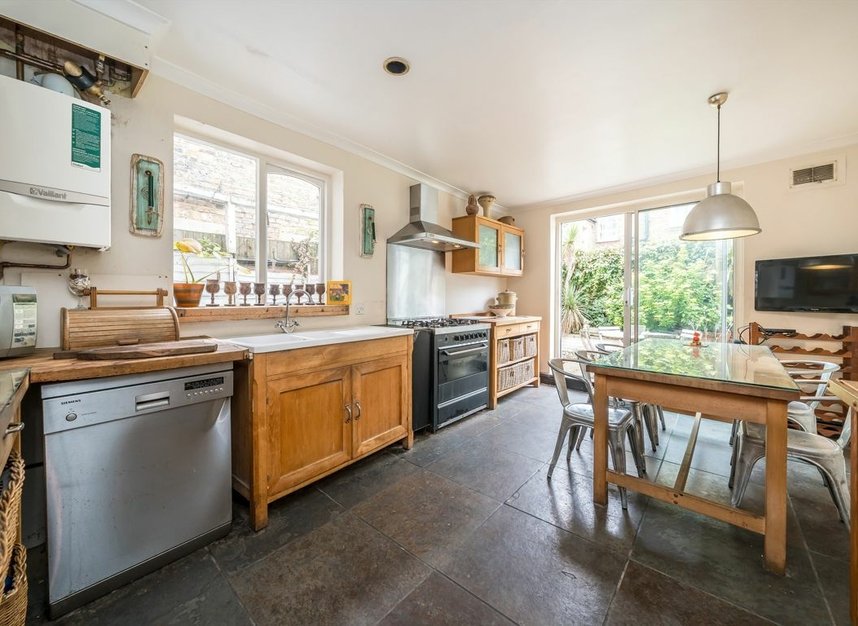 This spacious mid-terrace house offers four double bedrooms, two bathrooms, and generous living space throughout. The ground floor features a double reception room and an open-plan kitchen/dining area leading to a private patio garden.