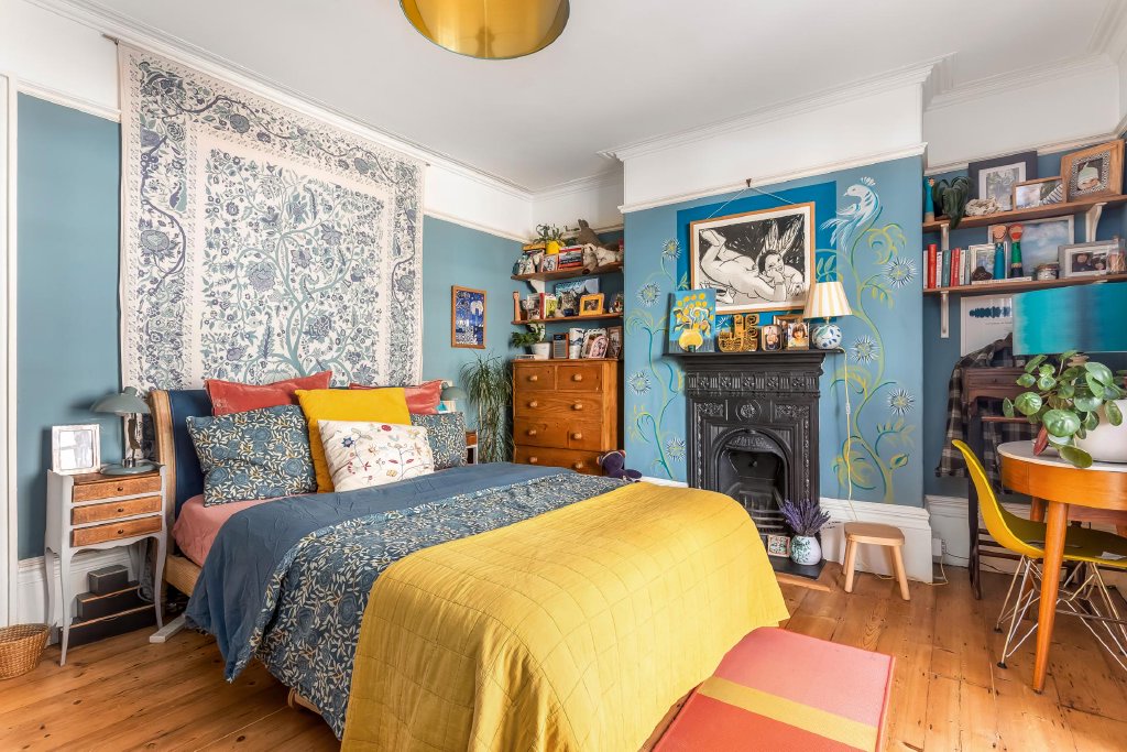 Farrow and Ball Inchyra Blue painted walls and soft oatmeal carpet are in the adjacent bedroom, chimney breast alcoves add to the floor space and a sash window offers views of the Brighton rooftops.