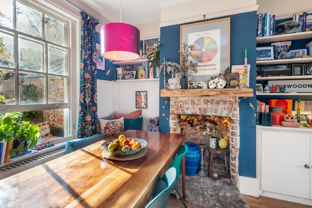 A multi-paned sash window overlooks the pretty enclosed courtyard from the dining room and elegant Farrow and Ball Stiffkey blue walls adds to the charm and character of the space.