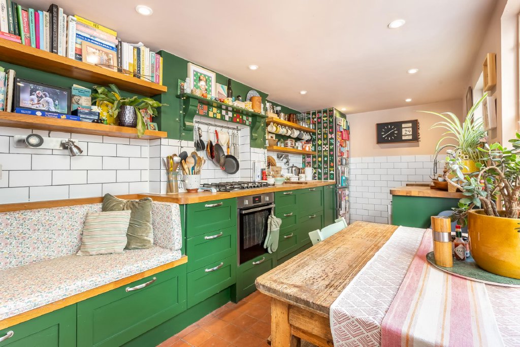 Wood worktops sit beneath sleek white metro tiles in the family-sized kitchen. Fully fitted with a wealth of heritage green cabinets, deep butler sink and integrated appliances, there is plenty of space for a breakfast table and a cosy built in bench. The pantry at the far end provides invaluable storage and a demi-glazed door opens directly onto the enclosed, pretty courtyard.