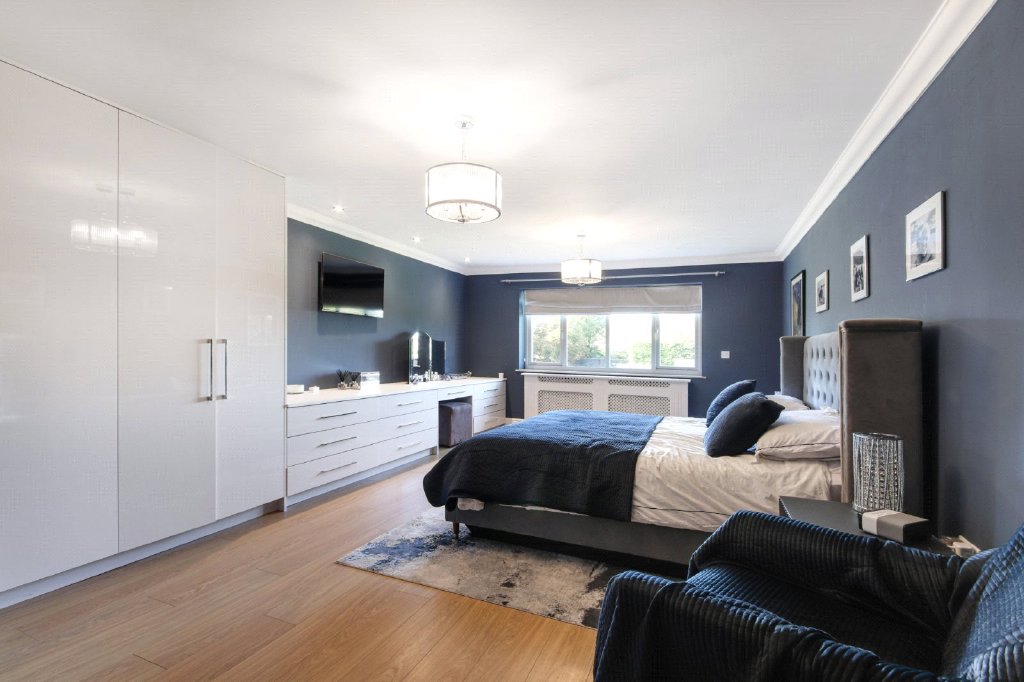 Main Bedroom 24'9" (7.54m) at longest point x 13'3" (4.04m). Double glazed window to rear. Plain coved ceiling with downlights. Wood effect flooring. Radiator. Fitted wardrobe. Walk-in wardrobe. Thermostat.