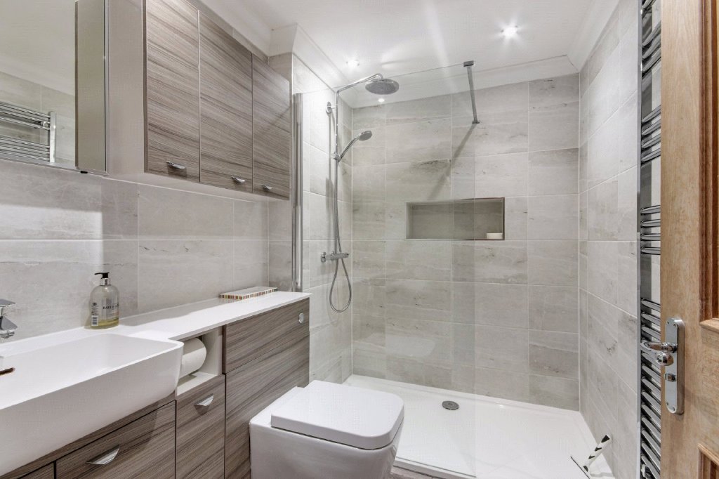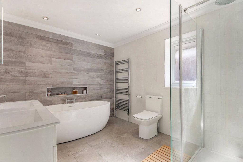The first floor hosts the superb principal suite with a walk-in wardrobe and luxury en-suite bath and shower room. A further bedroom enjoys its own en-suite, while three additional bedrooms are served by a stylish family bathroom. Rising to the second floor are two spacious bedrooms with eaves storage and a shower room, ideal for teenagers or guests. Underfloor heating runs throughout the ground floor with radiators to the upper levels, while oak doors with chrome fittings add to the sense of quality and attention to detail.