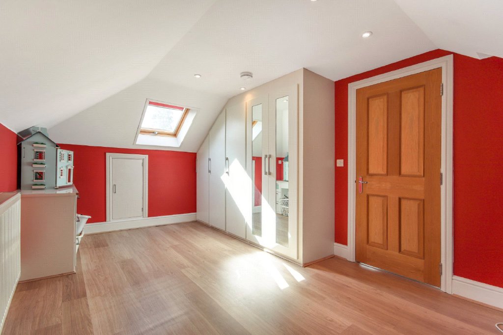 Bedroom Five 15'7" x 9'10" (4.75m x 3m). Double glazed Velux window to side. Apex plain ceiling with downlights. Wood effect flooring. Radiator. Fitted wardrobe. Door to eaves. Loft hatch.