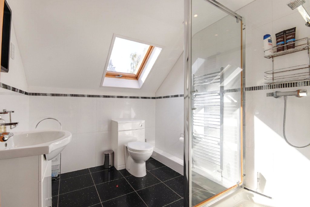 Shower Room 8'6" x 6'11" (2.6m x 2.1m). Double glazed Velux window to side. Apex plain ceiling with downlights. Extractor fan. Tiled flooring. Tiled walls. Heated towel rail. Shower cubicle. Low level WC. Wash hand basin in vanity unit with mixer tap. Shaver point.