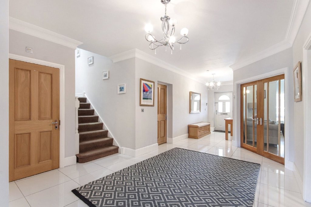 Entrance Hall Double glazed frosted leaded light effect door to front. Plain coved ceiling. Tiled flooring with underfloor heating. Smoke alarm. Security alarm system. Storage cupboard. Door leading to garage.