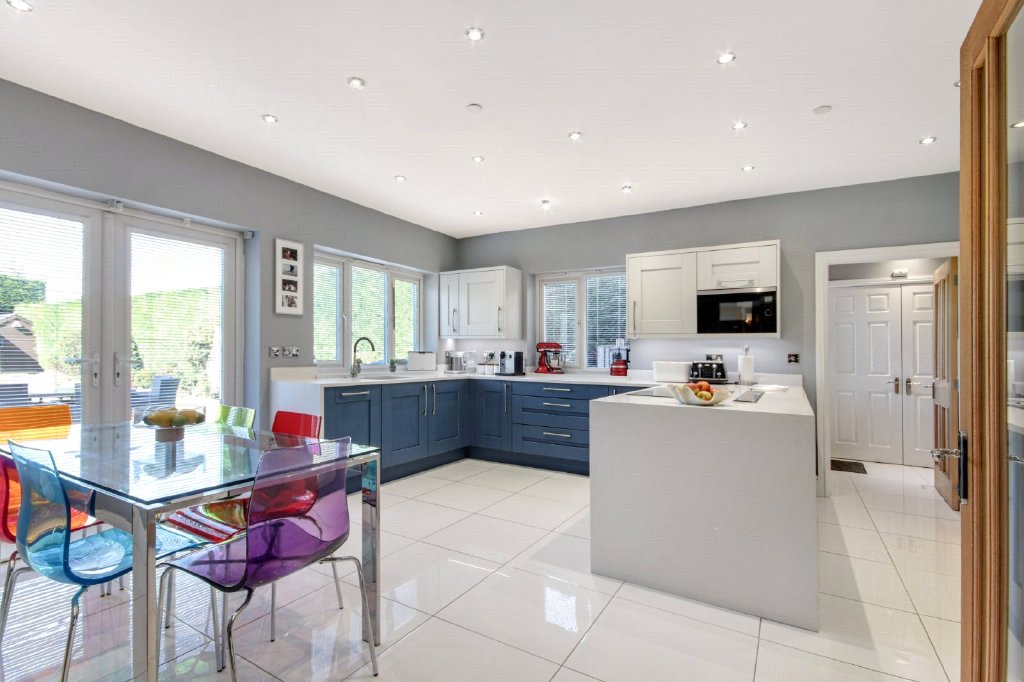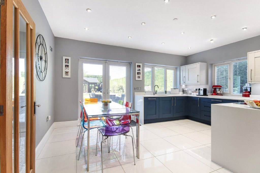 Kitchen/Breakfast Room 16'3" x 15'7" (4.95m x 4.75m). Double glazed panelled door to kitchen. Double glazed frosted door to rear. Double glazed windows to rear and side. Plain ceiling with downlights. Tiled flooring with underfloor heating. Fitted wall and base units with work surfaces over. Neff hob with Neff extractor over. Two Neff ovens. Inset stainless steel one and a half bowl Carron Phoenix sink and drainer unit with mixer taps and insinkerator. Bosch dishwasher. Two fridge/freezers.