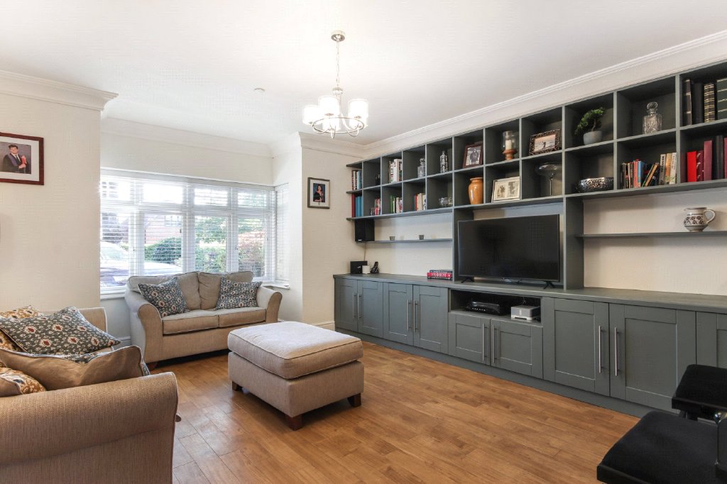 Family Room 18' (5.49m) extending into bay 19'7" (5.97m) x 13'10" (4.22m). Double glazed bay window to front. Plain coved ceiling. Karndean Amtico effect flooring with underfloor heating. Fitted base units. Wall lights.