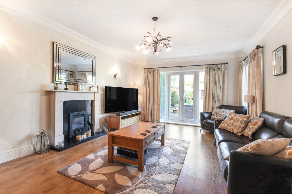 Sitting Room 19'7" x 13'10" (5.97m x 4.22m). Double glazed frosted door to rear. Double glazed window to side. Double glazed patio doors leading to garden. Plain coved ceiling. Karndean wood effect flooring with underfloor heating. Ceiling light. Wall lights. Thermostat. Gas fire. Door to leading to entrance hall.