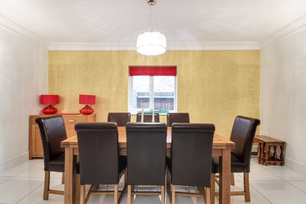 Dining Room 16'5" x 9'8" (5m x 2.95m). Double glazed window to side. Plain coved ceiling. Tiled flooring with underfloor heating. Wall lights. Thermostat. Glazed panelled door leading to entrance hall.