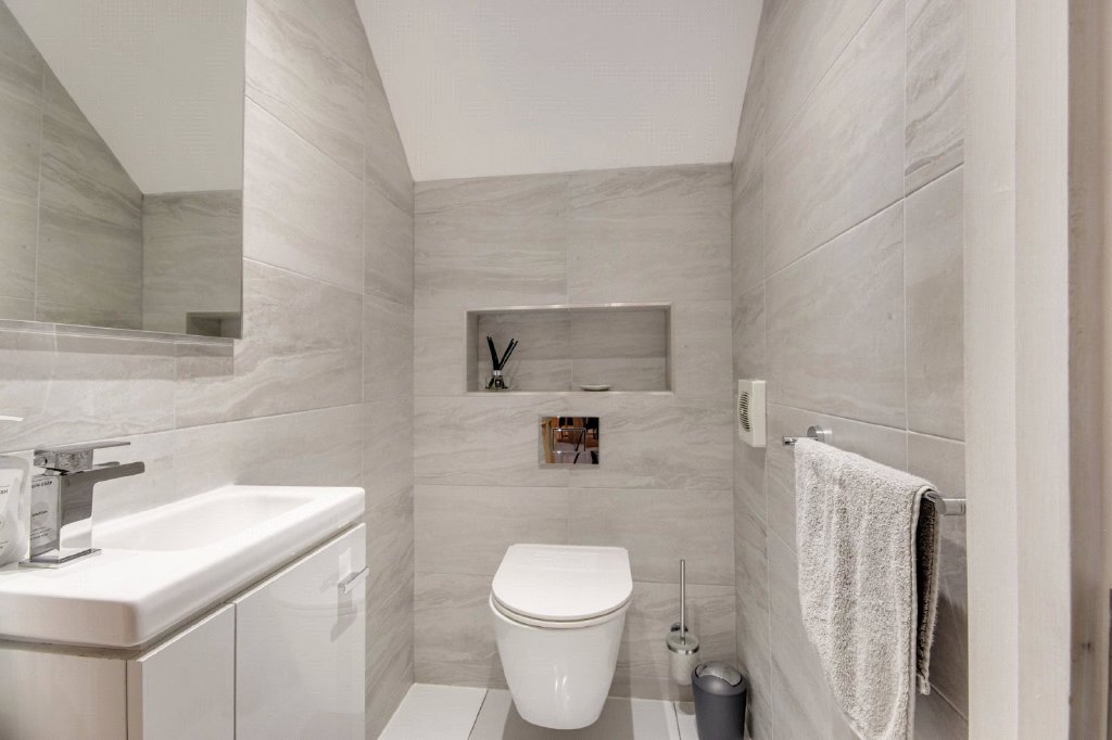 Cloakroom 4'3" x 3'4" (1.3m x 1.02m). Plain ceiling with downlights. Tiled flooring with underfloor heating. Plain ceiling. Extractor fan. Tiled walls. Low level WC. Wash hand basin in vanity unit with mixer taps. Mirror.