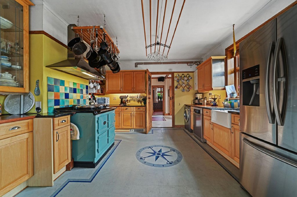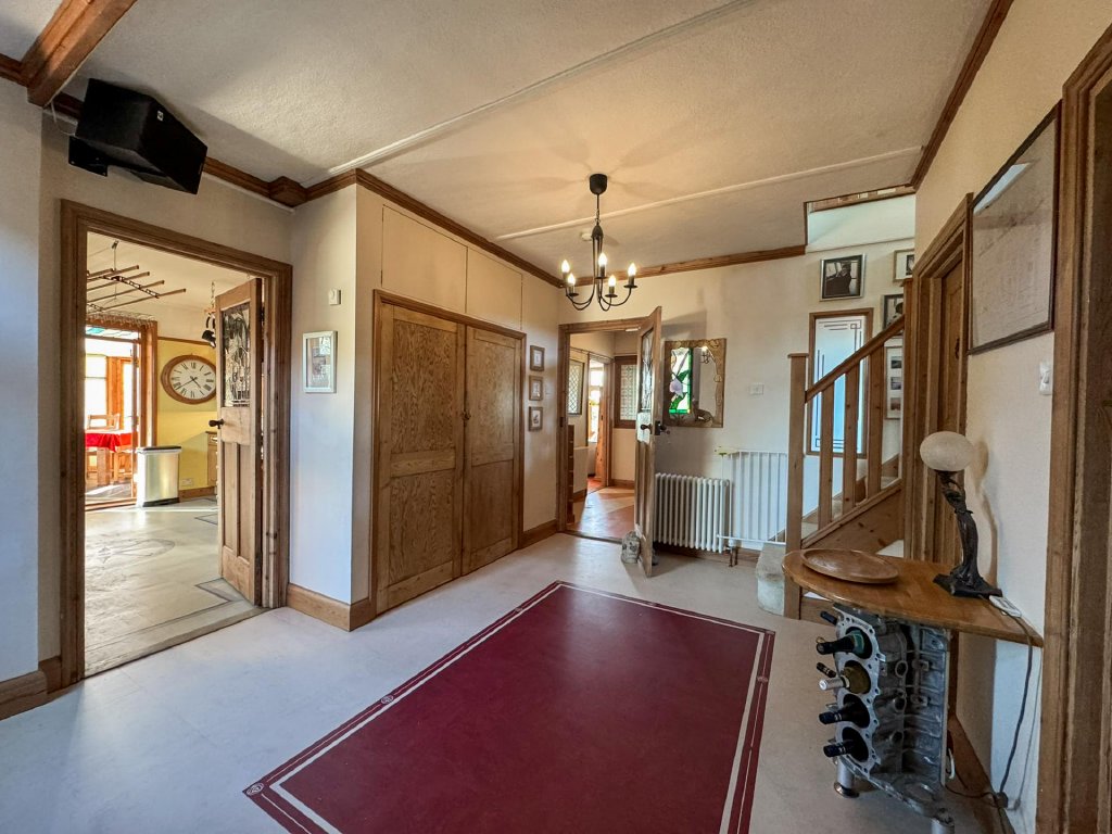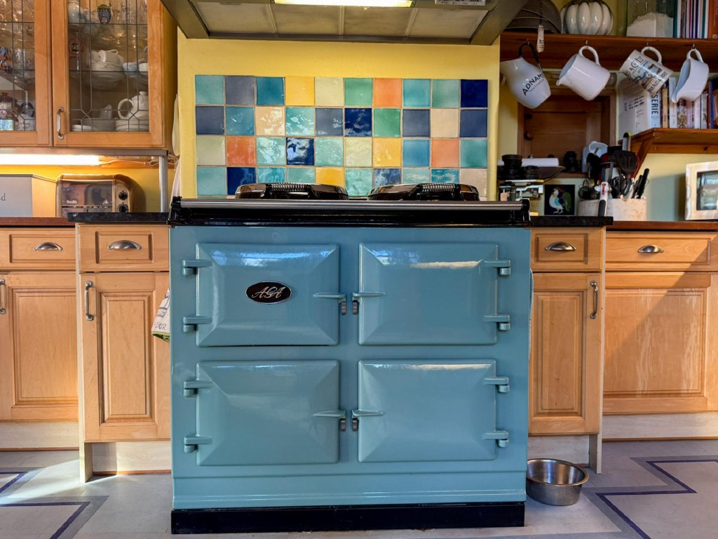 Further double doors lead into a beautifully appointed kitchen with traditional cabinetry, a butler sink, and an Aga Dual electric oven, ideal for family cooking and baking. From the hallway, an internal dining room offers space for gatherings and connects to a versatile room that can serve as a fifth bedroom, study, or pantry, alongside a family bathroom retaining its original charm.