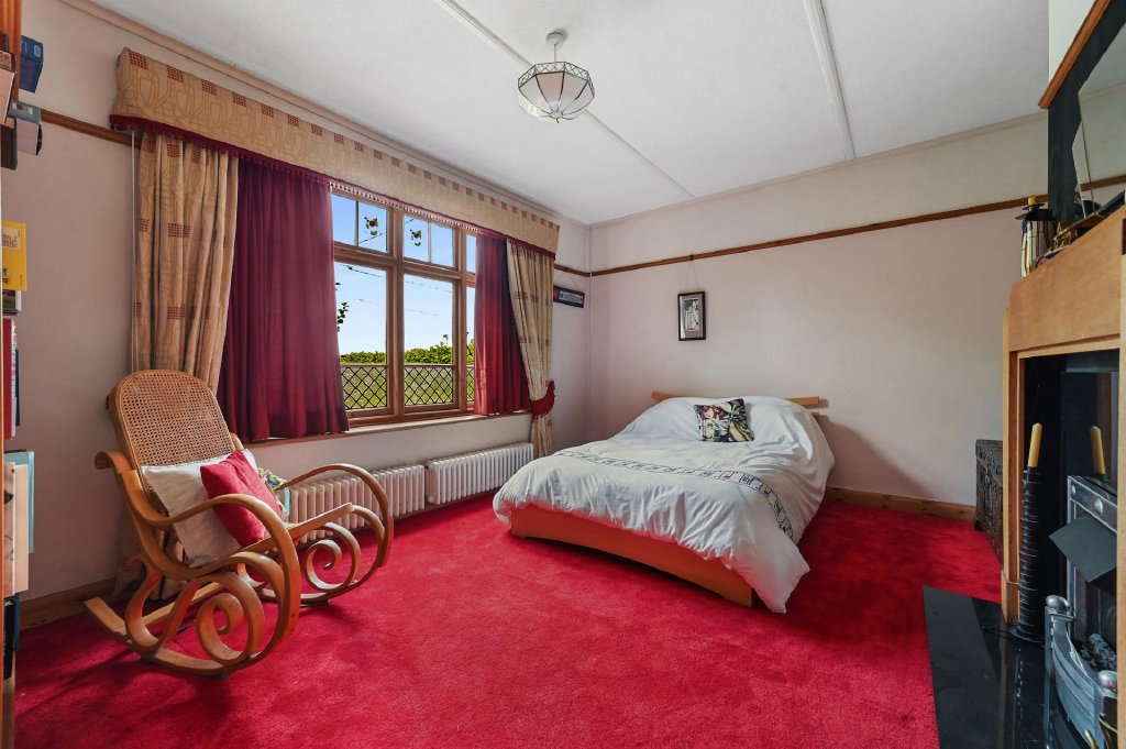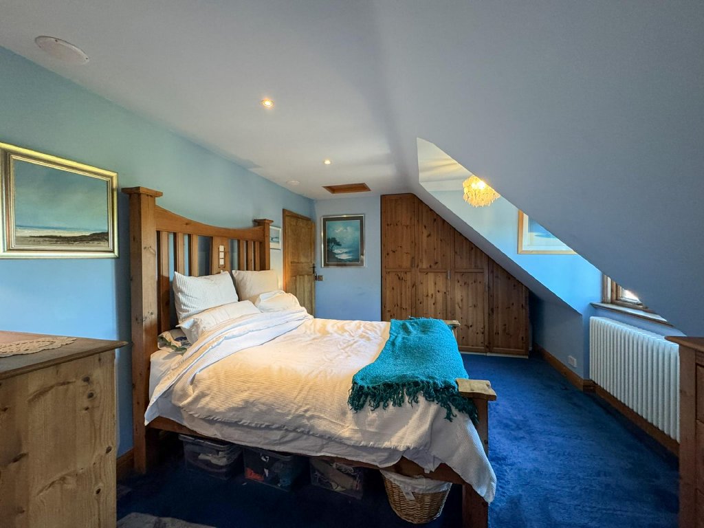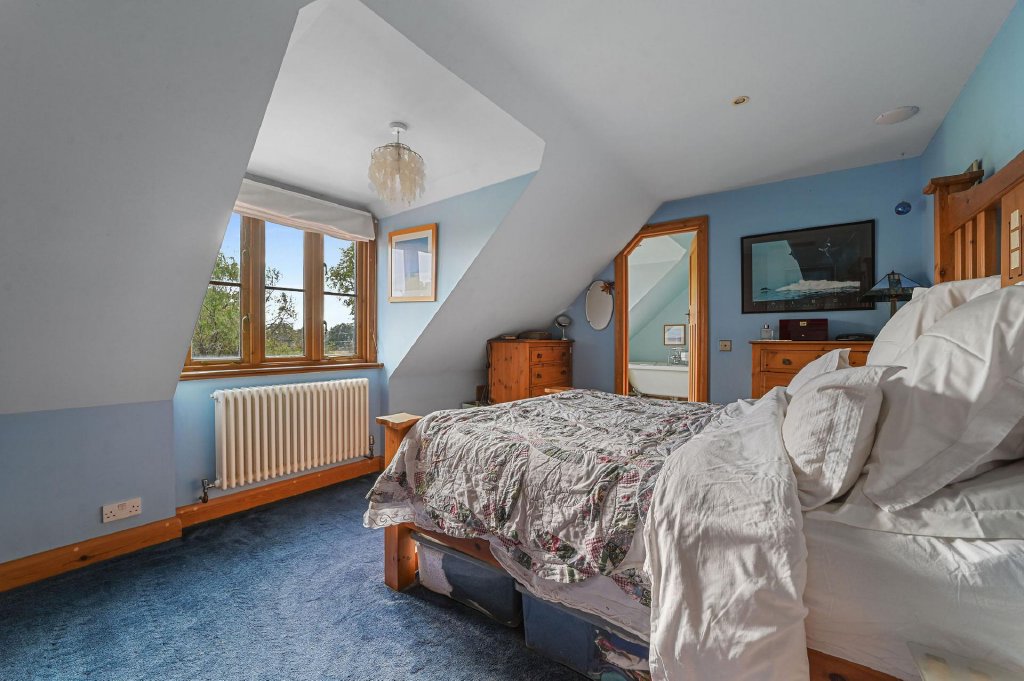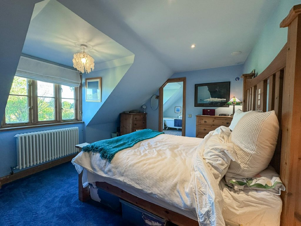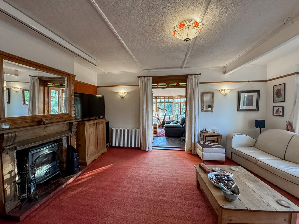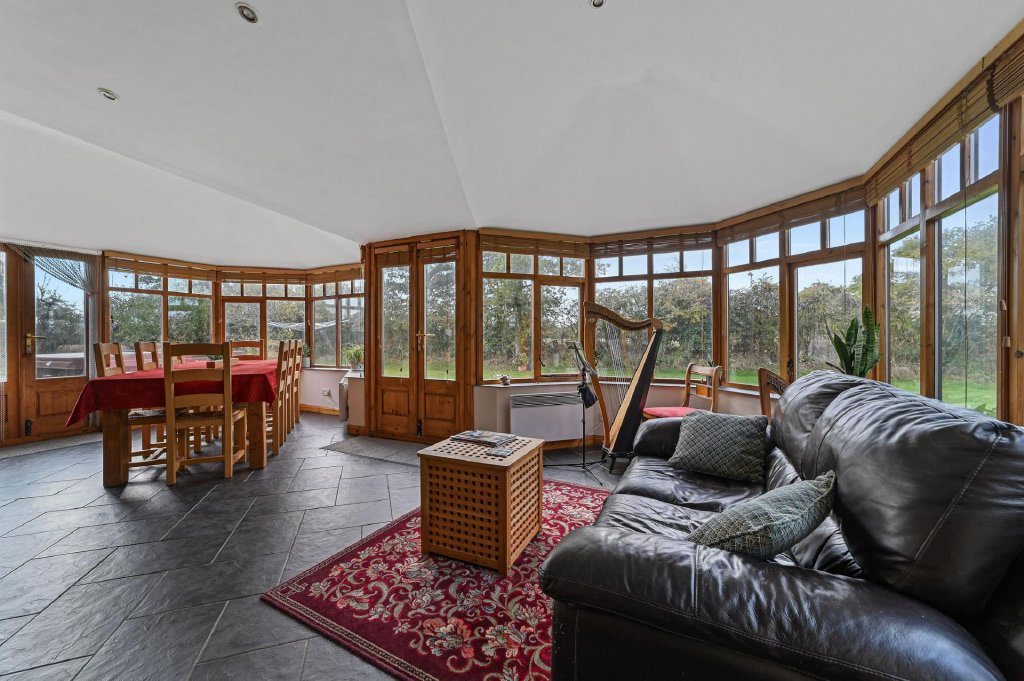 To the left lies a bright and airy ground floor bedroom with a large front-facing window, ideal as a guest room or snug. To the right, a comfortable living room with a multi-fuel stove provides a warm and relaxing space to unwind, with double doors opening into a stunning timber-framed garden room that wraps around the home to the east, south, and west. Flooded with natural light by day and softly illuminated by LED windowsills at night, this is the perfect space for entertaining or enjoying tranquil garden views.