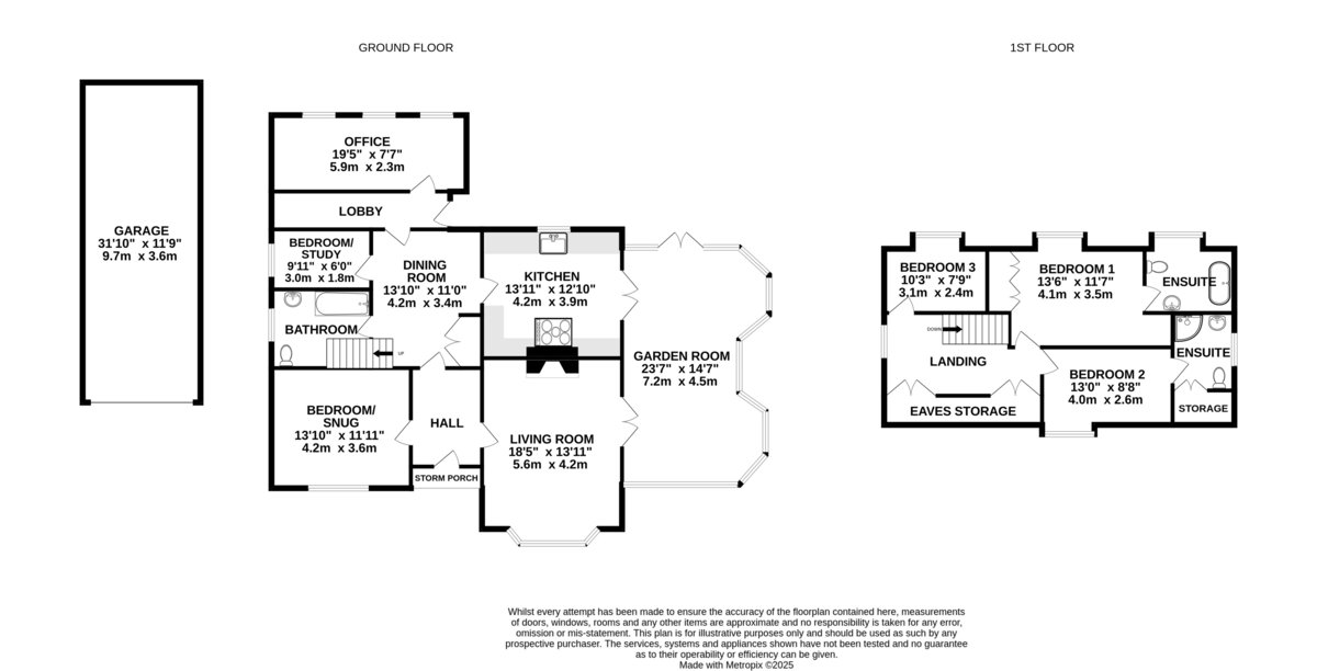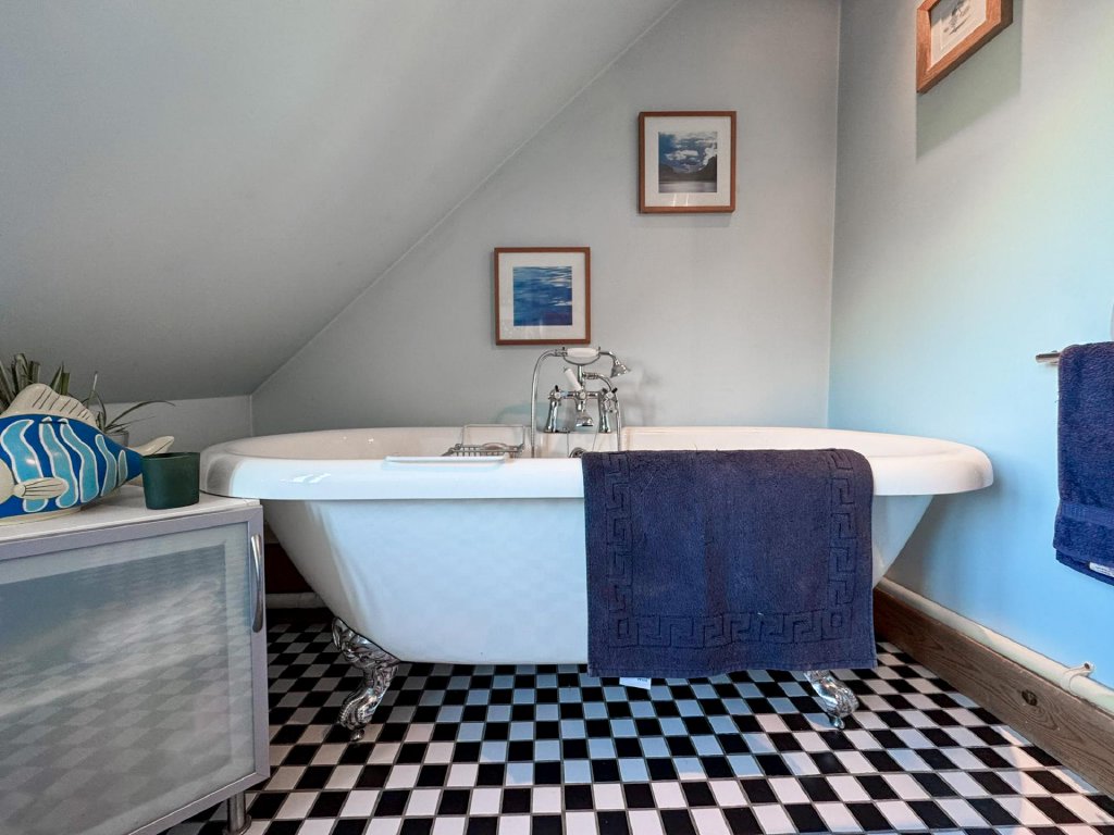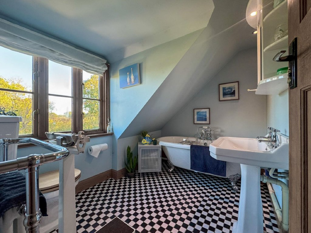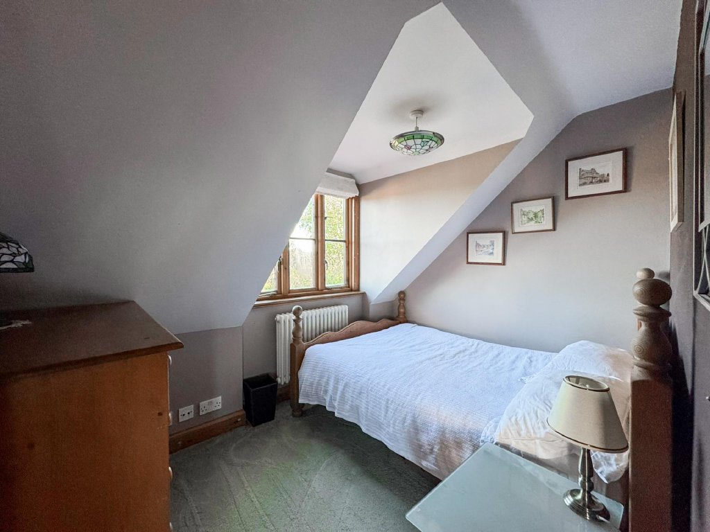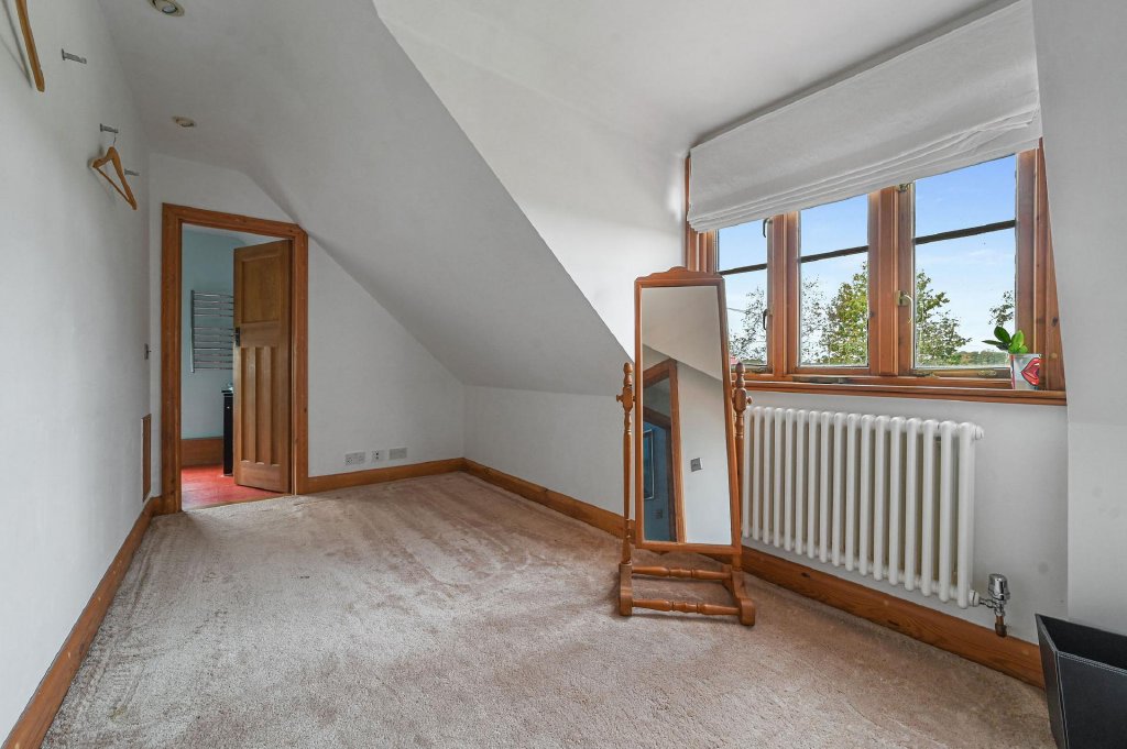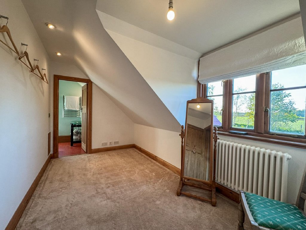 A stable door leads to a covered passageway with additional storage and access to a timber-built, insulated outbuilding currently used as an office-perfect for working from home in peace. Upstairs, the landing opens to generous eaves storage and three well-proportioned bedrooms, two of which feature their own en suite bathrooms, offering privacy and comfort for family or guests.