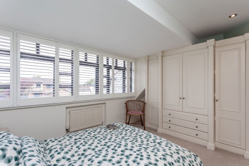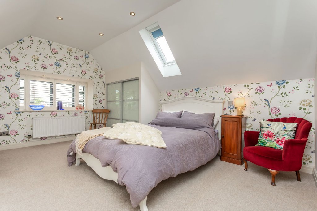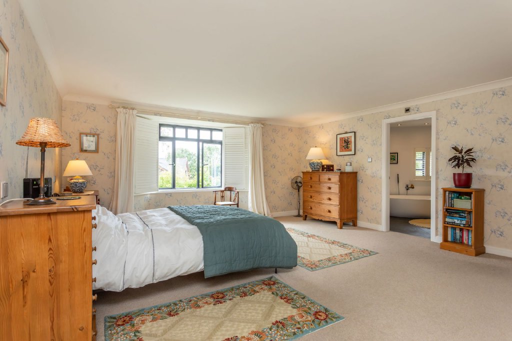 Rising to the first floor landing there is a generous shelved linen cupboard. The final reception space is on this level; double doors open to reveal a vaulted living room, naturally well lit with a glass balustrade providing visual connection with the kitchen and garden room below and a super view above the garden room’s roof to the greenery of the garden. A restful room, whether it’s for reading, catching up on emails or as a dedicated hobby space.There are four bedrooms on the first floor. The principal bedroom is a delight, a spacious room with a stylish bathroom having a large oval Stonewood bath, rainfall shower, twin Corian topped vanity unit and WC. The adjoining dressing room provides extensive fitted open fronted wardrobes and matching freestanding storage units.