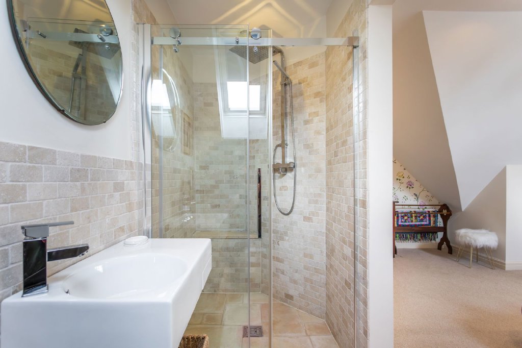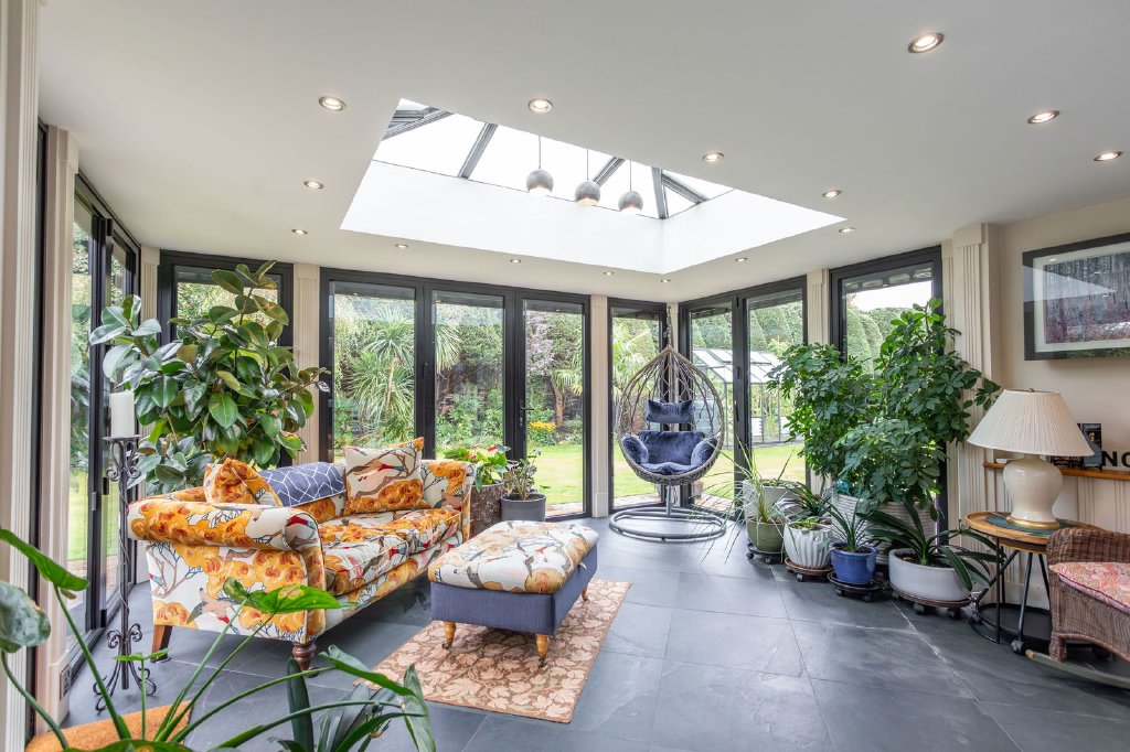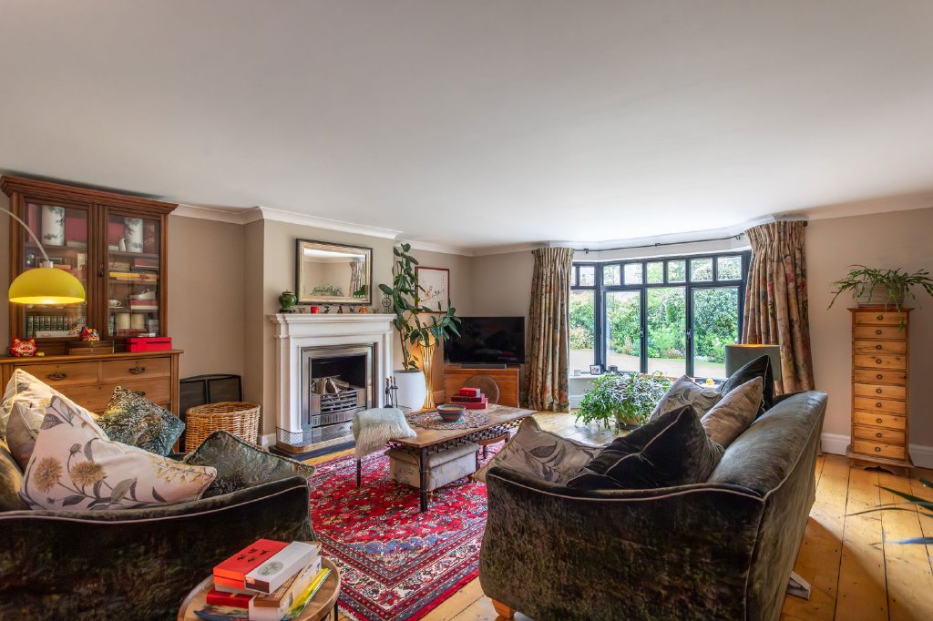 The office is a lovely place to work with wide pine floorboards and a bay window looking out to the front garden and passing street life. It could also be repurposed as a ground floor bedroom, served by the wet room, for less mobile guests or for a degree of future proofing as family life evolves. The atmospheric sitting room is a large and well-proportioned room with a wide bay window overlooking the garden, pine floorboards and a carved marble surround to an open fire. From the dining hall, double doors open to the fabulous kitchen which in turn is also open to the garden and family rooms. It’s an incredibly interesting space, especially when you look up and appreciate the glass balustraded living room above; individual rooms are connected but separate. The kitchen will delight keen cooks with a Corian topped central island and wrap around breakfast bar, well equipped and with banks of oak drawers (rather than cupboards) for easy and plentiful storage. The slate floored garden room further extends life out into the wrap around greenery of the garden, a stunning space with triple aspect glazing (the three complete sides offer bi-bolding doors to the garden) and a roof lantern allowing light to flood in from all angles.