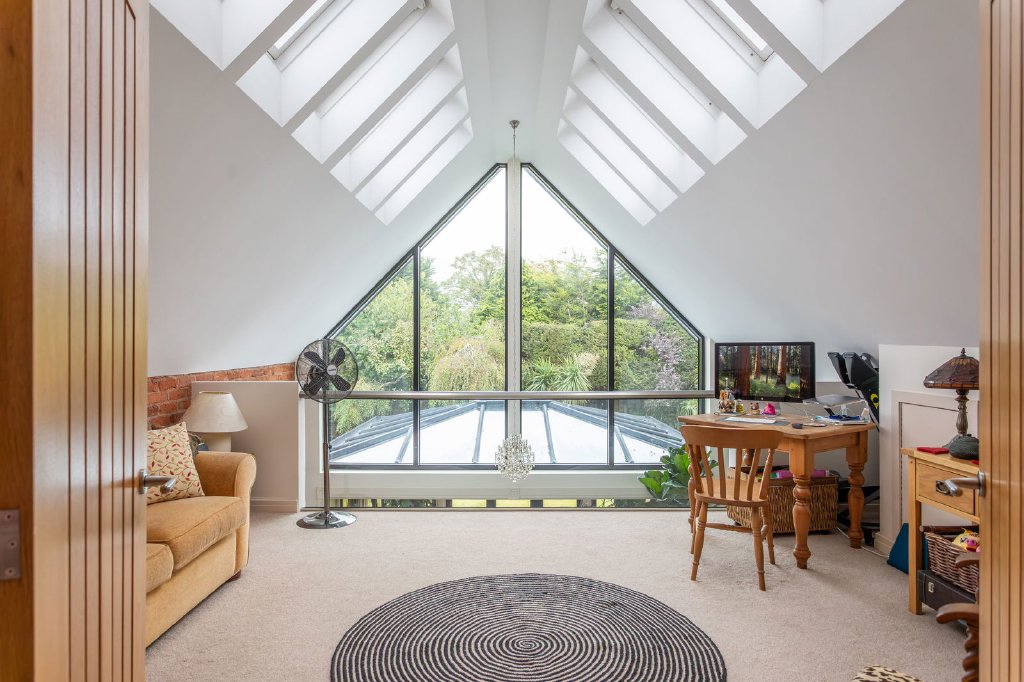 The kitchen opens to the characterful family room where striking tall angular windows are placed either side of the suspended oval Dik Geurts wood burner. The double height bay window is equally eye catching and provides the perfect location for a tall Christmas tree. Completing the ground floor is a wet room, utility room and integral garage which has two electric doors.