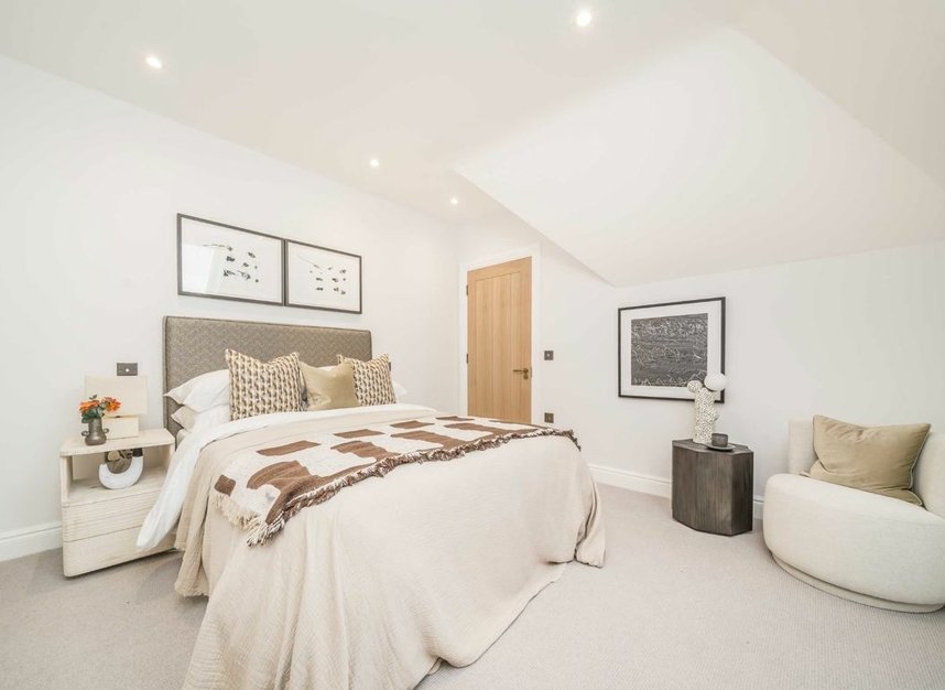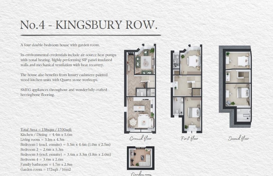 The residences at Kingsbury Row provide well-proportioned accommodation spanning over three floors, plus an additional summer house, perfect for use as a home office or gym. Four double bedrooms, Luxurious bathrooms, Herringbone flooring and bespoke kitchens with SMEG appliances throughout.