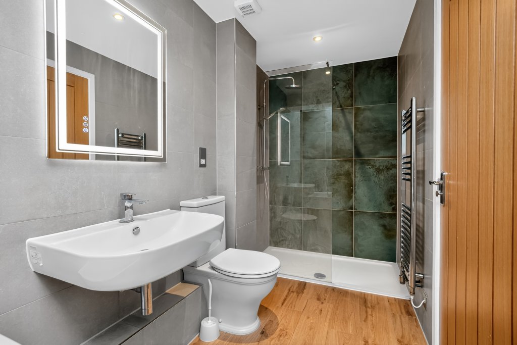 One of six houses in the secluded spot on the edge of the village of Bruton set within walking distance to the Bruton town center. Four Bedrooms - One Office - One En-Suite - Family Bathroom - Garden and Parking. Come and have a look for yourself! An elegant front door opens at the top of a small flight of steps to a hallway with access to an impressive kitchen/living area and utility room that make up the ground floor. The ‘Masterclass’ kitchen is luxuriously equipped with pull out larder, quartz worktops and integrated appliances that include a Neff fridge freezer, a Neff oven and induction hob and a Neff dishwasher. A dual height island is illuminated by three stylish lanterns and doubles as a breakfast bar. Underfoot, Italian wood effect tiles are warmed by underfloor heating and two fully glazed doors open to a pretty terrace outside. The living area is well proportioned and defined by some elegant tongue and groove panelling on the walls. Completing the ground floor is a separate utility room with wc and space for a washing machine. A flight of stairs rises from the hall to the first floor landing with access to two bedrooms, a dressing room and a family bathroom. A second staircase rises to the second floor with the principle bedroom with en suite bathroom and a fourth bedroom. All the bedrooms are generously proportioned and come with good views of the gardens and the surrounding countryside. The bathrooms are beautifully furnished with heated chrome towels, ‘state of the art’ mirrors with built in lighting options and high end fixtures and fittings. Individual thermostats allow zoned heating.