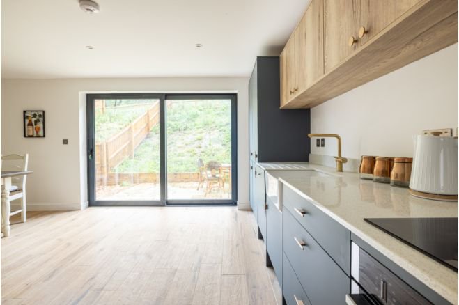 Superb contemporary home | Newly renovated | Buyer Incentive - Ask the Developer | Allocated parking for two cars |EV Charging| Masterclass Kitchen with Neff Appliances | Secluded location | Ready to move in An elegant front door opens at the top of a small flight of steps to a hallway with access to an impressive kitchen/living area and utility room that make up the ground floor. The ‘Masterclass’ kitchen is luxuriously equipped with pull out larder, quartz worktops and integrated appliances that include a Neff fridge freezer, a Neff oven and induction hob and a Neff dishwasher. A dual height island is illuminated by three stylish lanterns and doubles as a breakfast bar. Underfoot, Italian wood effect tiles are warmed by underfloor heating and two fully glazed doors open to a pretty terrace outside. The living area is well proportioned and defined by some elegant tongue and groove panelling on the walls. Completing the ground floor is a separate utility room with wc and space for a washing machine. A flight of stairs rises from the hall to the first floor landing with access to two bedrooms, a dressing room and a family bathroom. A second staircase rises to the second floor with the principle bedroom with en suite bathroom and a fourth bedroom. All the bedrooms are generously proportioned and come with good views of the gardens and the surrounding countryside. The bathrooms are beautifully furnished with heated chrome towels, ‘state of the art’ mirrors with built in lighting options and high end fixtures and fittings. Individual thermostats allow zoned heating.