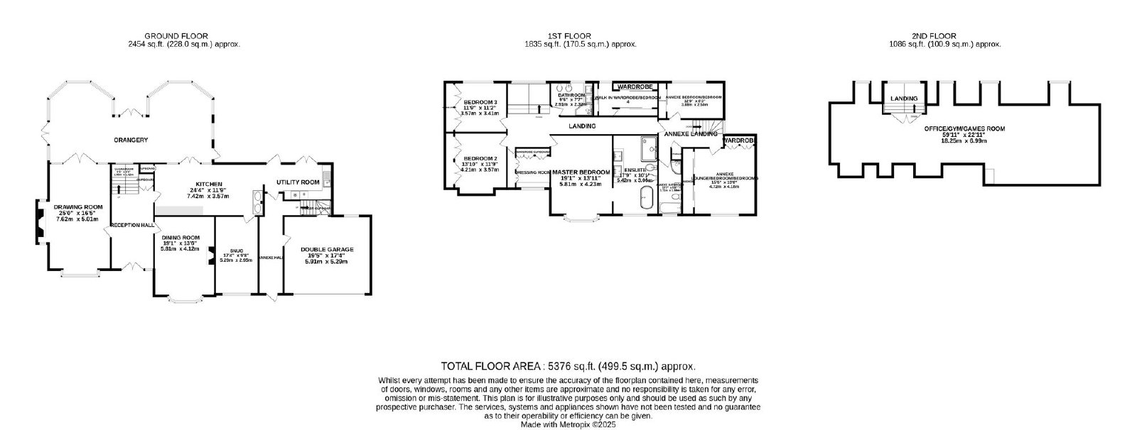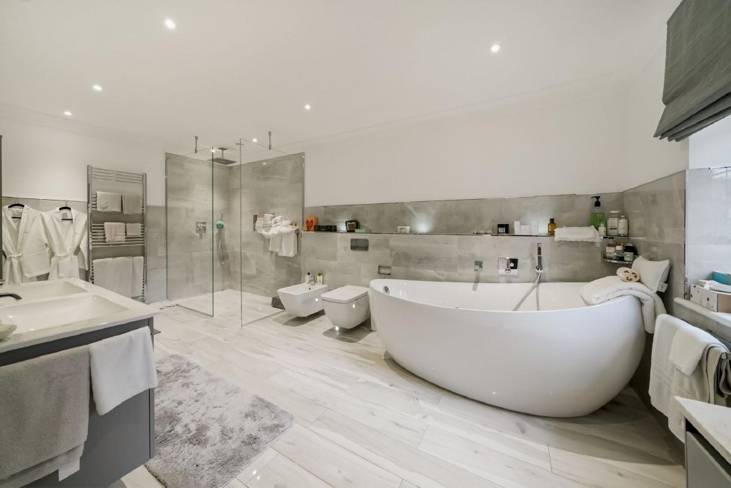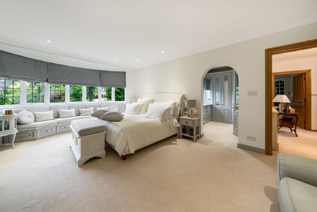 The master bedroom suite, a luxurious retreat, featuring a working fireplace, window seat, and custom fitted dressing room. The recently refitted and remodeled en-suite boasts underfloor heating, a bespoke bathroom organiser, oversized slipper bathtub, and walk-in rain shower wet room area. Five further bedrooms, all with a range of built in, bespoke bedroom furniture, with bedroom 4 currently configured as a luxurious walk-in wardrobe but can be easily converted back to a bedroom, study or nursery. Rising to the second floor, a magnificent, multi functional room of huge dimensions, currently used as a home office and with ample space to accommodate a home gym and games room, all with excellent head space and lots of natural light via dormer windows.