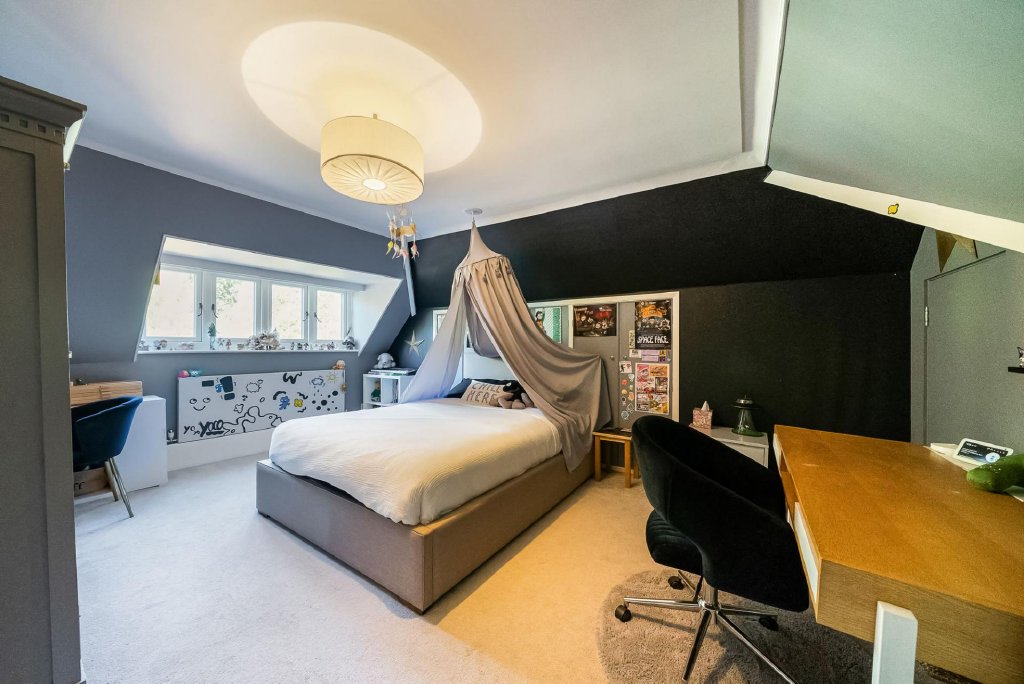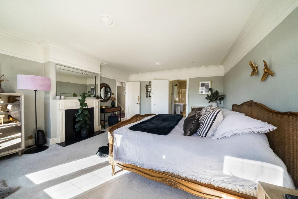 A wide, curved, lovingly restored original staircase leads to a cosy reading/snug area on the first landing and leading up there’s three bedrooms on the first floor. The principal suite enjoys garden views, bespoke Hammonds wardrobes, and a luxurious en-suite with twin His & Her sinks, walk-in wet room, and freestanding bathtub. A magnificent guest bedroom features a walk-in wardrobe and en-suite with underfloor heating, while a further bedroom is equally well appointed. Rising to the second floor, two additional bedrooms are served by a stylish petite shower room, with excellent eaves storage integrated around the bigger bedroom.