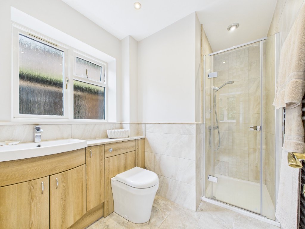 The house sits proudly on its plot, enjoying privacy and sunshine throughout the day. The interior flows beautifully — from the welcoming entrance hall and spacious living room with bay window, through to a sitting area and dining room, all linking naturally to the south-facing garden via French doors. The large dining kitchen is a true highlight, fitted to a high standard and offering plenty of space for family meals and entertaining.
