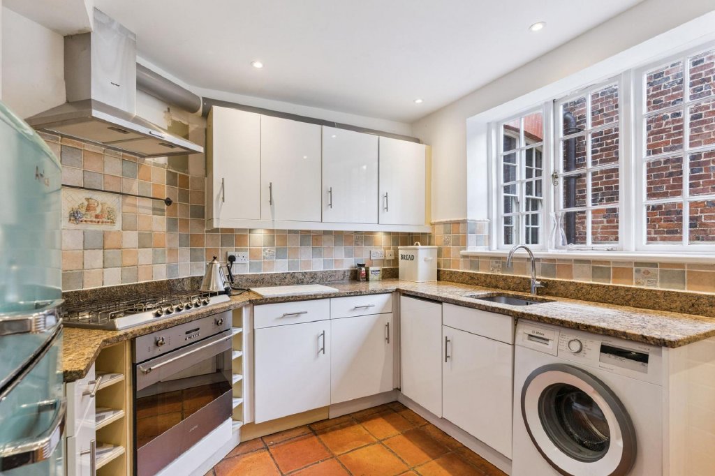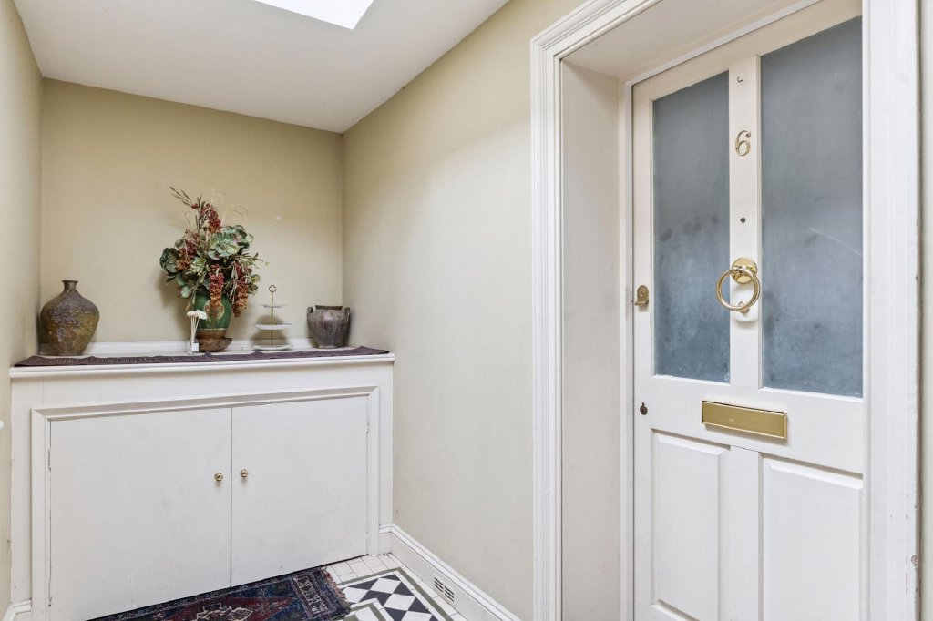 Upon entering through the communal lobby, a private door opens into a welcoming entrance hall, leading into a bright and airy formal sitting/dining room. This elegant space enjoys views across the front communal grounds and features an original open fireplace — ideal for cosy evenings or for hosting formal gatherings with family and friends. Adjoining the sitting/dining room, the separate country-style kitchen is fitted with a range of wall and base units, an integrated oven with gas hob, and space for additional appliances. From the sitting/dining room, a door opens onto the courtyard, which offers a tranquil outlook across the private communal gardens at the front of the estate.