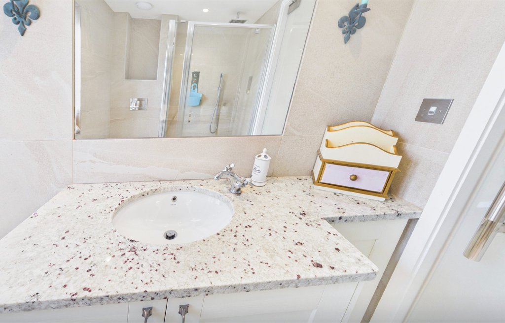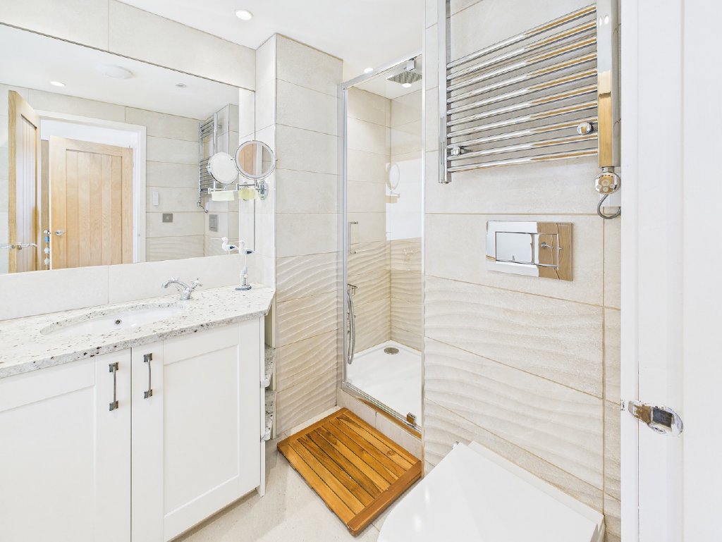 The accommodation is arranged with a clever reverse-level layout. The ground floor opens into a welcoming entrance hall, leading to three generous double bedrooms, each served by luxurious bathrooms that echo the property’s meticulous attention to detail.