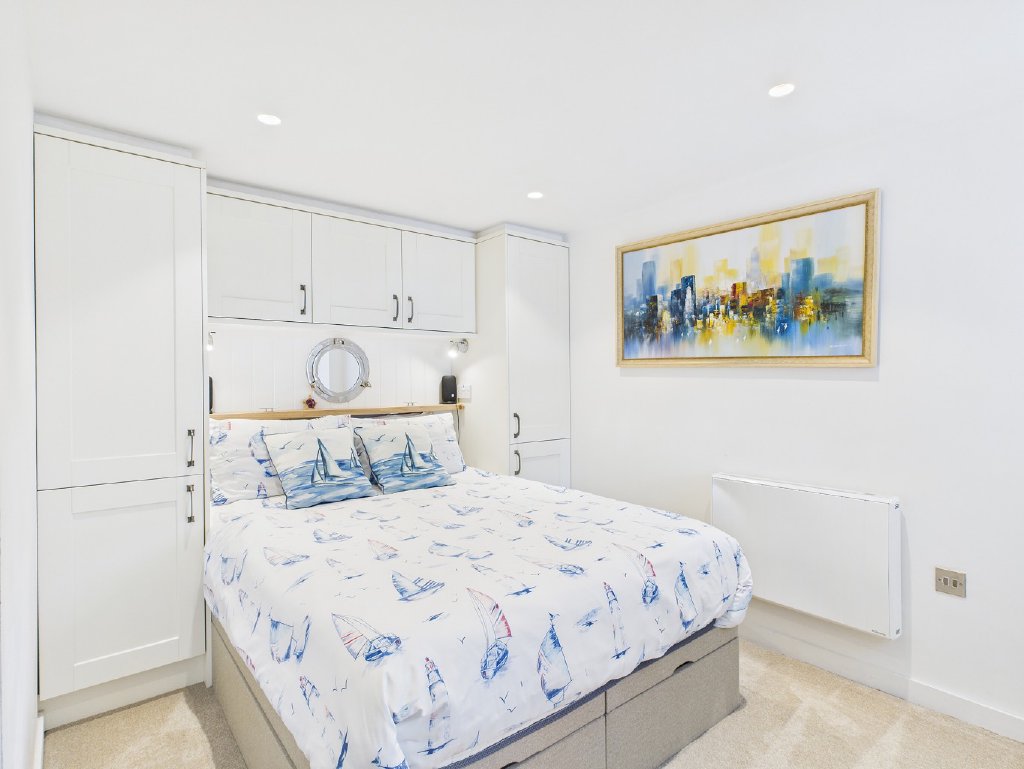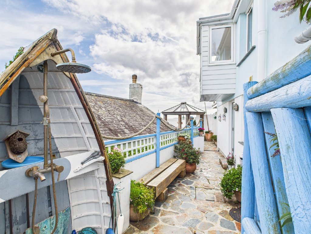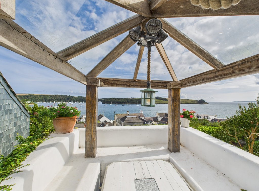 Beyond the main house, the garden reveals further surprises. A charming garden room provides flexible space – currently used as an occasional overflow guest bedroom and housing laundry appliances – while a cleverly designed pergola area takes outdoor living to another level. Its hydraulic lift table transforms with ease, becoming a daybed for lounging in the sunshine, with spectacular views over towards Falmouth Bay. Practicality has not been forgotten: the property boasts a private parking area large enough for at least two vehicles, a genuine rarity in the centre of St Mawes.