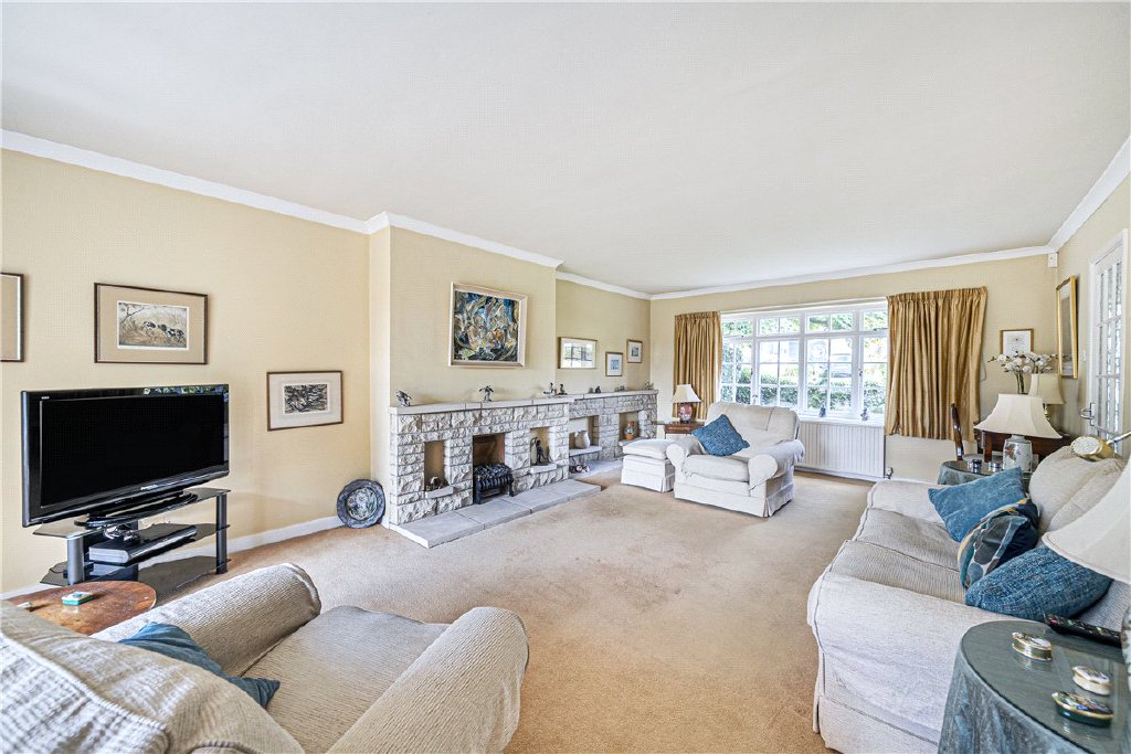 This is a very desirable modern detached house, in need of updating and offering spacious and light accommodation across two floors. The porch opens into a large and welcoming reception hall. Doors either side of the hall give access to both the kitchen/breakfast room and the living room, both spanning the depth of the house and opening into the garden. Between the two is a central dining room. These rooms have potential to be opened up into one, or to be extended to the rear.