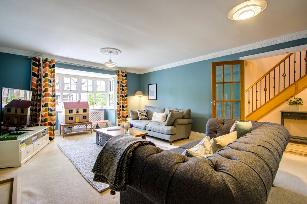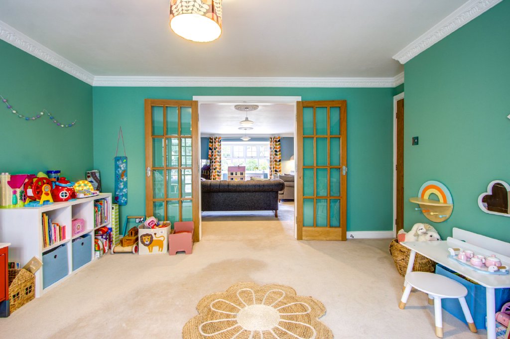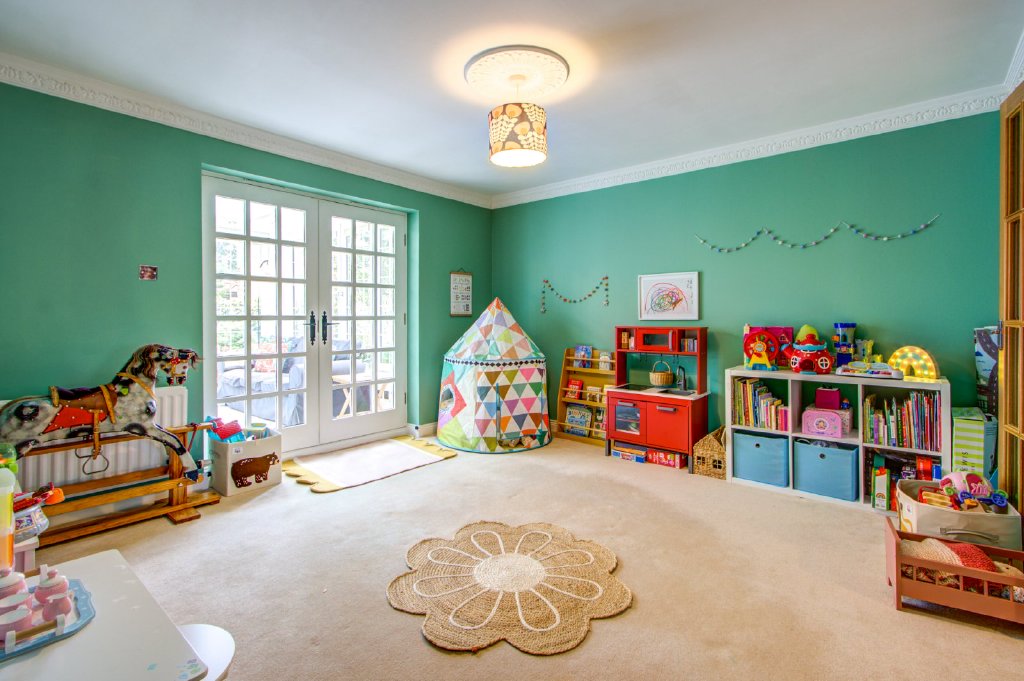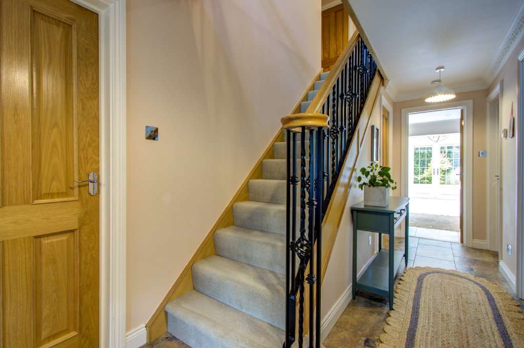 An inviting vestibule and reception hall, with spacious under stairs storage area, welcome visitors into this stunning home. With glass doors connecting the elegant living spaces, each room flows seamlessly throughout the ground floor. The beautiful sitting room with its bay window and a feature stone fireplace housing a multi-fuel stove, leads through to the dining room (currently used as a playroom). The highlight of the house is the stunning orangery with an expansive open-plan family kitchen/breakfast room. This airy and luminous space is the heart of the home, with doors leading out to the beautiful gardens, offering an oasis of calm and tranquillity. The bespoke luxury fitted kitchen boasts integrated appliances, a Rangemaster stove and stylish quartz work surfaces. The dining area provides ample space to accommodate a large table for family gatherings and entertaining. For those working from home, the large study/snug, which is fitted with bespoke cabinetry provides an ideal workspace. The utility room leads out to the garden and a cloakroom/WC completes the ground floor accommodation.