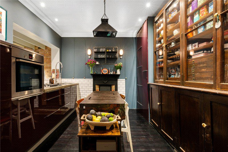 The reception room showcases double-glazed windows, original wood flooring, and a feature fireplace, creating a cozy yet elegant space. The kitchen preserves its original flooring and features a range of modern wall and base units, built-in cupboards, half-tiled walls, integrated appliances, a cast-iron central island workstation, and a charming period fireplace.
