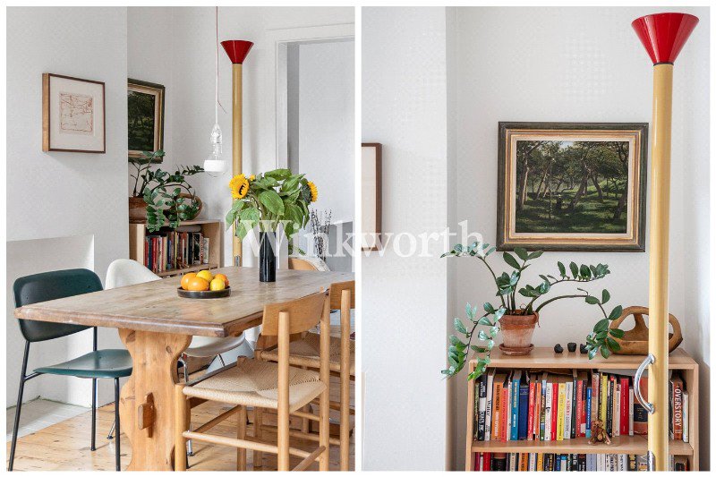 The ground floor flows naturally from front to back, with a welcoming reception room featuring a bay window, original pine floorboards and crisp white walls that enhance the sense of light and space. Built-in shelving and alcove storage add functionality without cluttering the room, while subtle design touches, like the tiled hearth and clean-lined fireplace, retain a nod to the home’s Victorian roots.