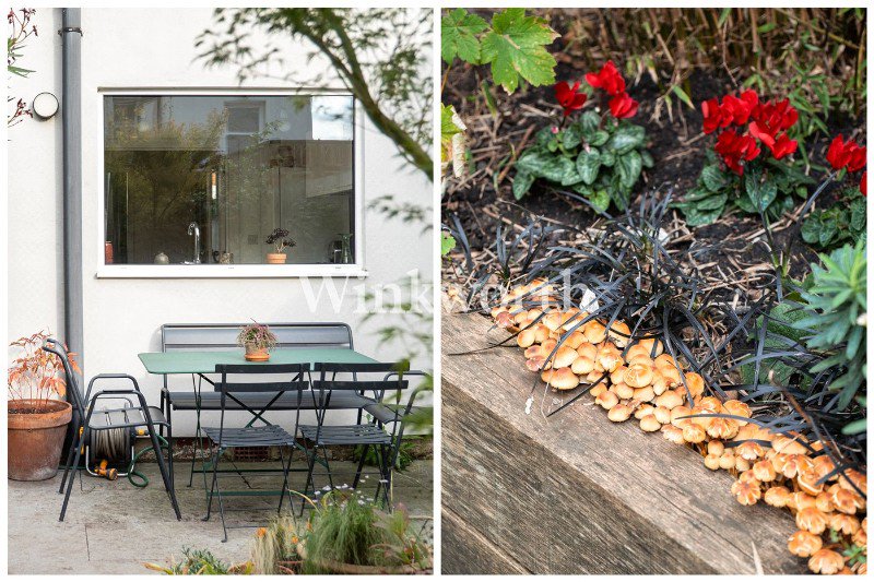 Outside, the garden feels lush and secluded, thoughtfully planted with a variety of shrubs, climbers and greenery. A built-in timber bench provides a quiet spot to sit among the foliage, while paved pathways wind through established beds, making the space both practical and serene.