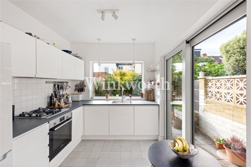 Double doors lead through to a contemporary kitchen finished in a timeless monochrome palette. White handleless cabinetry and tiled splashbacks are paired with dark composite worktops and integrated appliances, including a gas hob and oven. A large picture window perfectly frames the west-facing garden, while full-height sliding doors flood the space with natural light and provide effortless access to the outdoors.