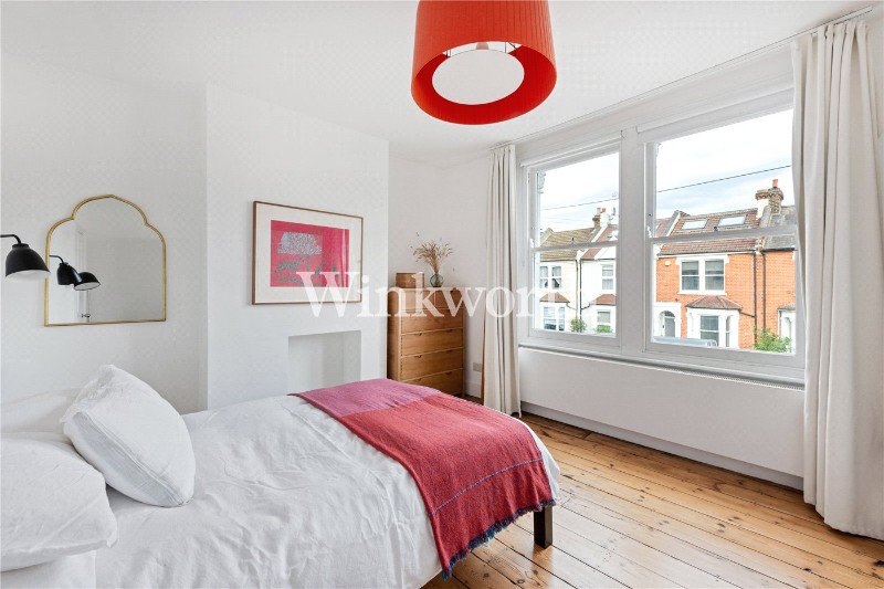 Upstairs, there are two generous double bedrooms, both with original wooden floors and elegant proportions. The principal bedroom spans the width of the house, offering ample space for freestanding or built-in storage, while the second double overlooks the garden to the rear.