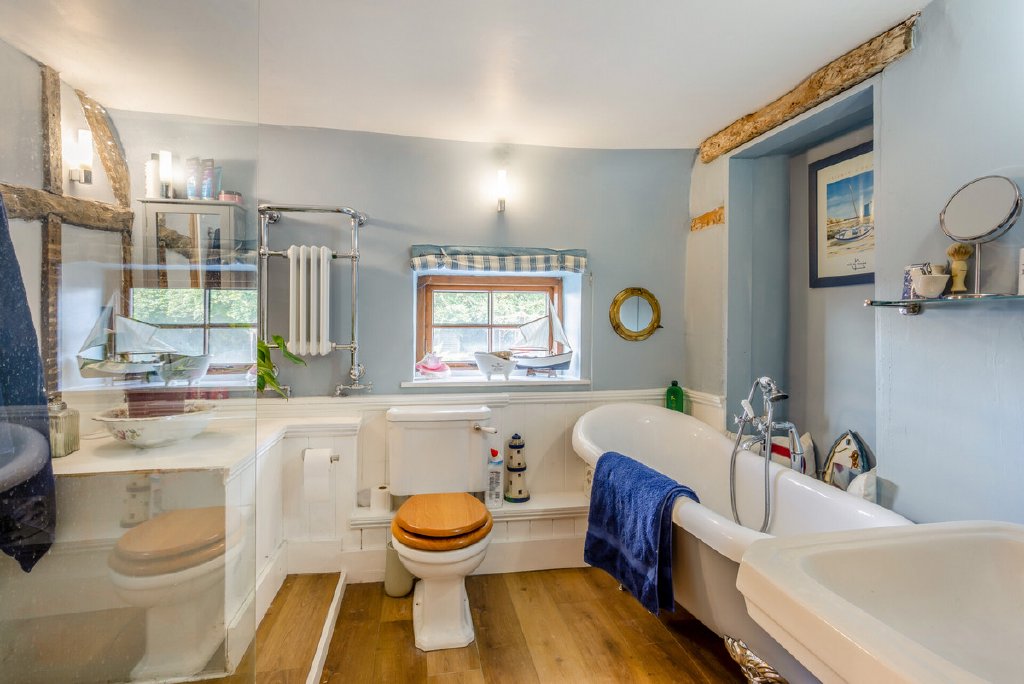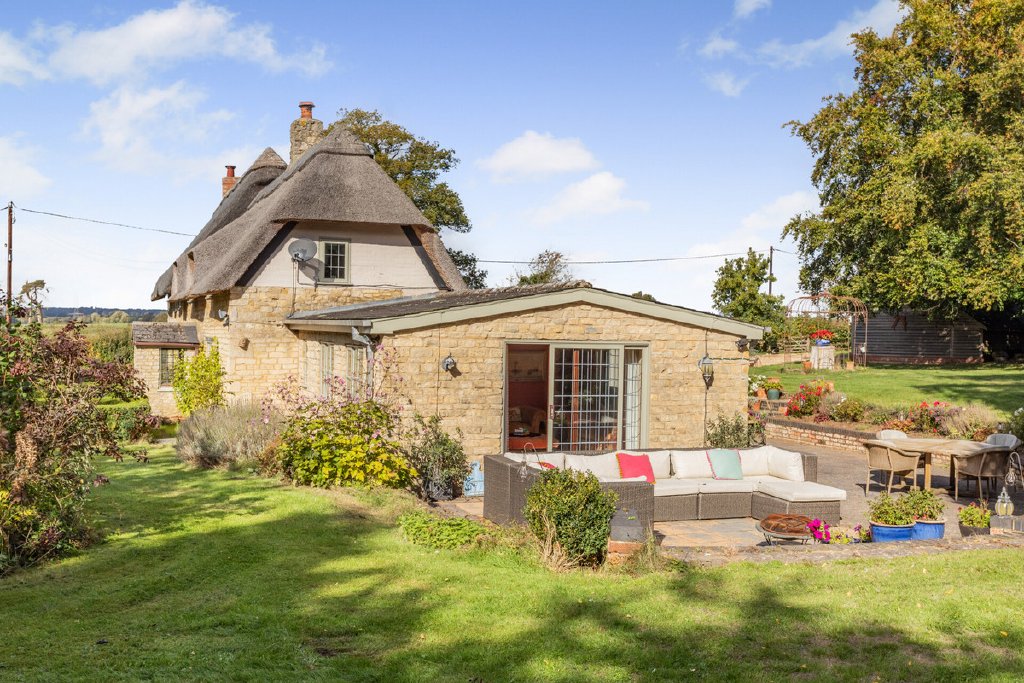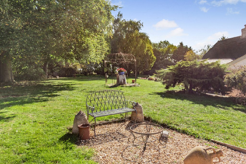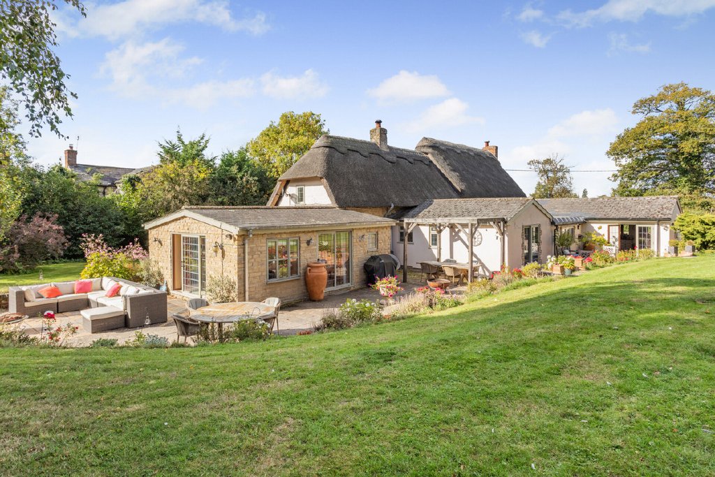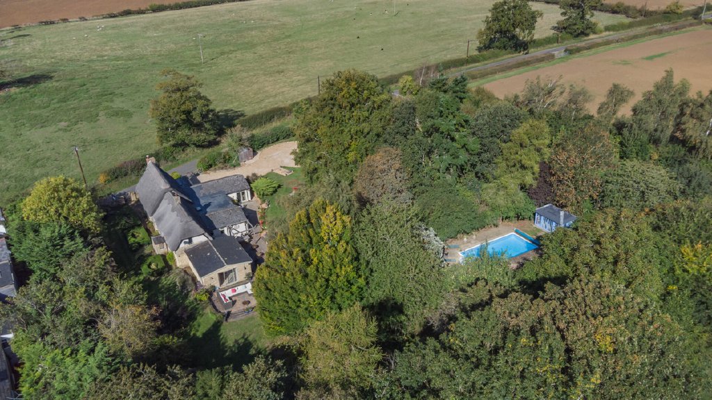 A handsome part thatched grade II listed village house with extensive ground floor accommodation set in a private and established 1.12 acre total plot. Benefits include wooden double-glazed windows, oil-fired central heating, heated outdoor swimming pool, character features throughout with working fireplaces. Four reception rooms, 4-5 bedrooms, 2 bathrooms (1 en-suite), 2 cloakrooms, bespoke fitted kitchen/breakfast room, generous parking, open double garage, barn and outbuildings with open countryside views.