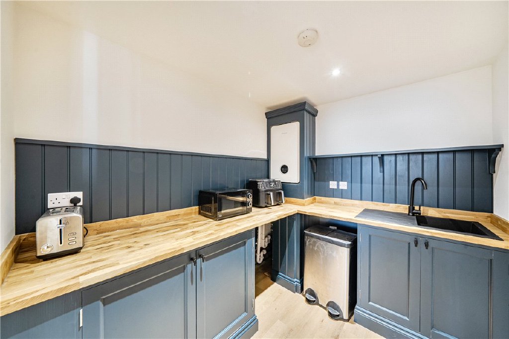 A large sitting room sits in the original part of the house, having an exposed local stone wall to one side with a wood burning stove installed. It has wide oak boards to the floor, which leads through to the state of the art kitchen/dining/family room. The kitchen is in the newly added extension, having fitted bespoke hand built wooden storage cabinets with granite worktops and a large central island, above which is the recessed ceiling with downlighters. Large glazed doors spill onto the south facing garden. At the far end of the house is a cosy guest bedroom with an en suite shower room, and next to this is a utility room.